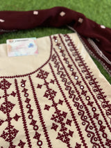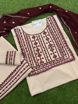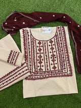 This exquisite hand embroidered suit is a must-have for any fashion enthusiast. With intricate mehroon embroidery on a skin colored base, it exudes elegance and grace. Elevate your style with this beautifully Hand crafted piece that is perfect for any occasion. Expertly made with precision and attention to detail, this suit will surely make a statement.