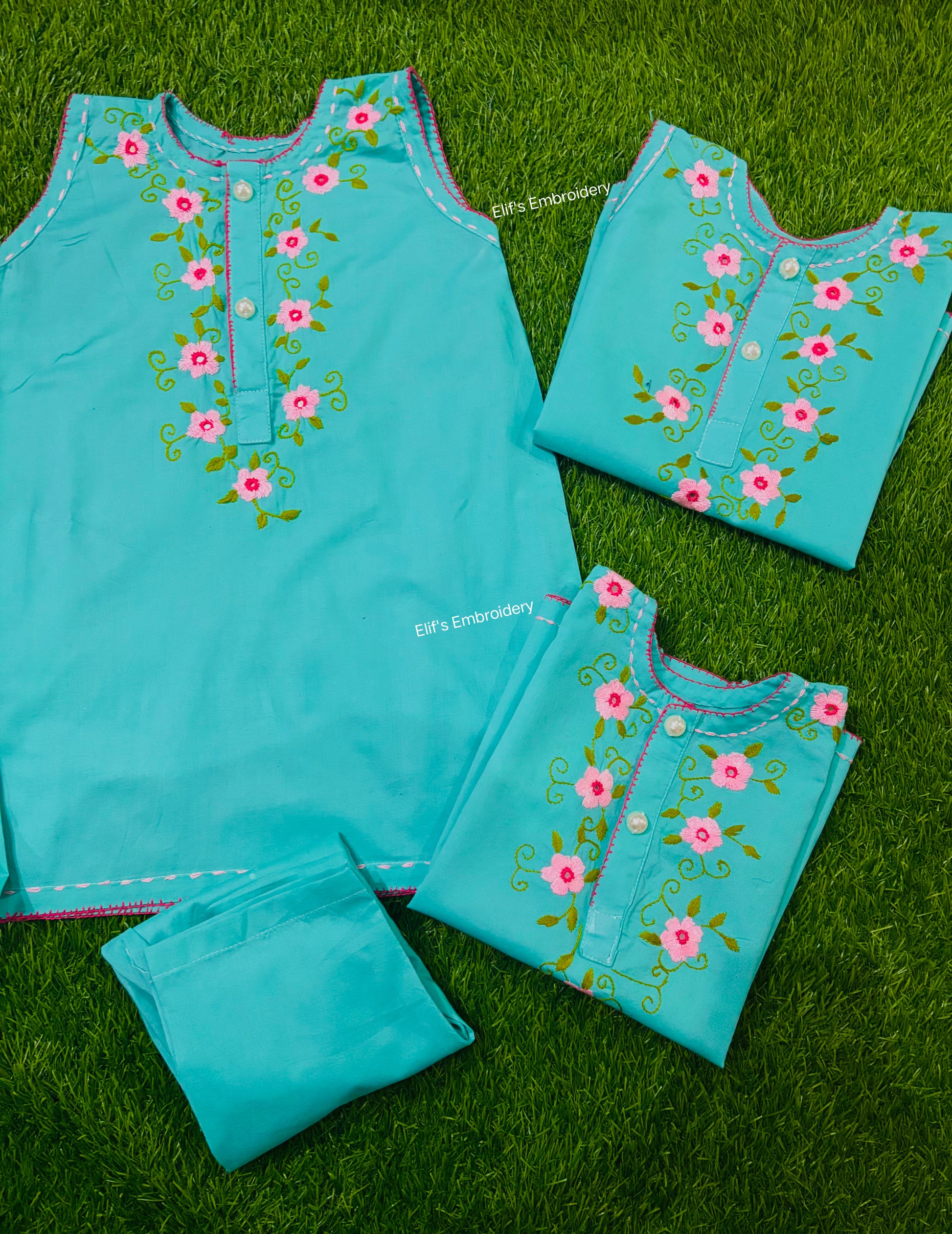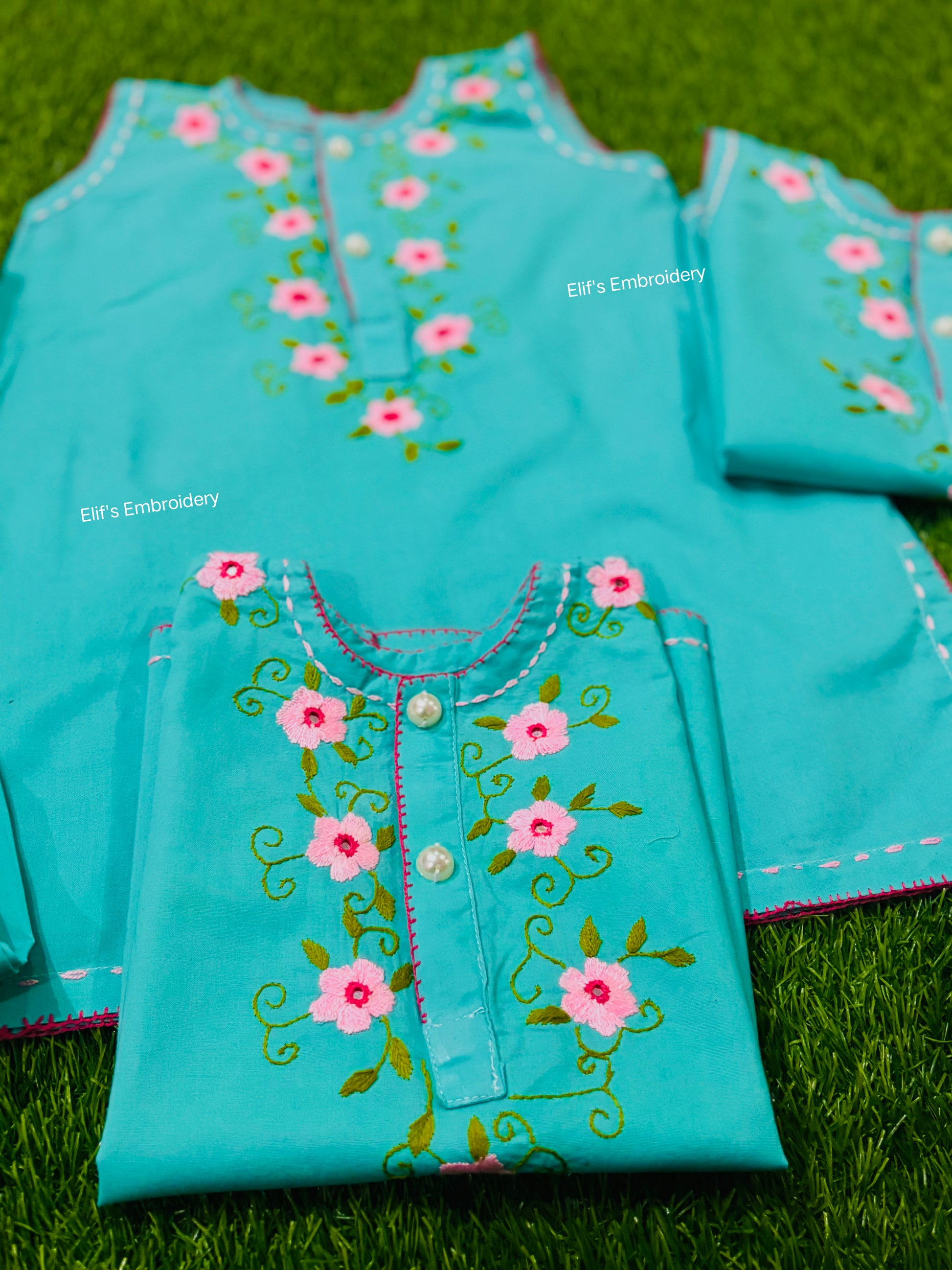 Aab-e-Zar - Kids features an elegant aqua colored hand-embroidered suit, perfect for any occasion. Made with high-quality materials, your child will feel comfortable and confident, making them stand out in style. Elevate their wardrobe with this stylish addition.