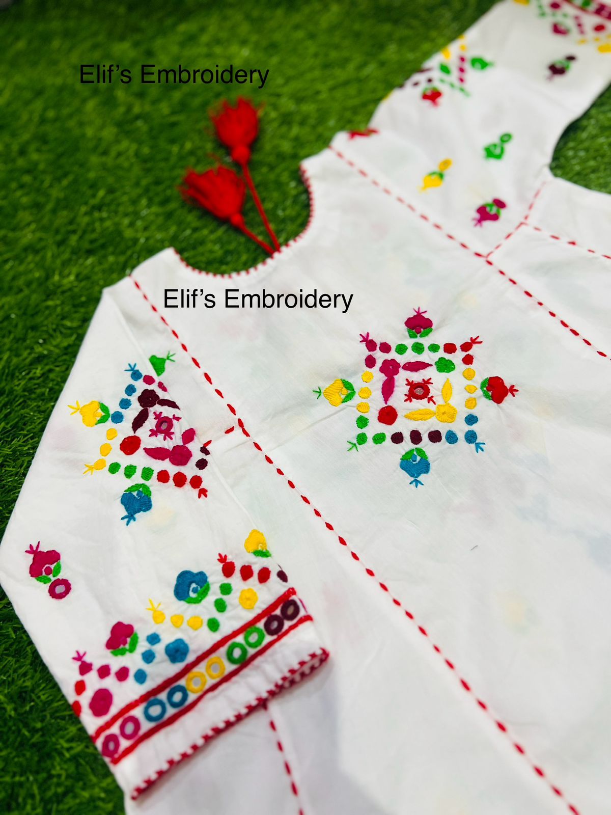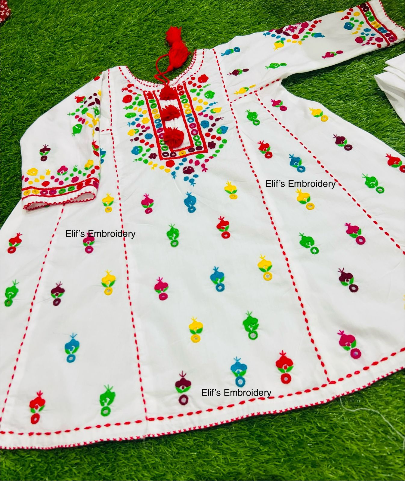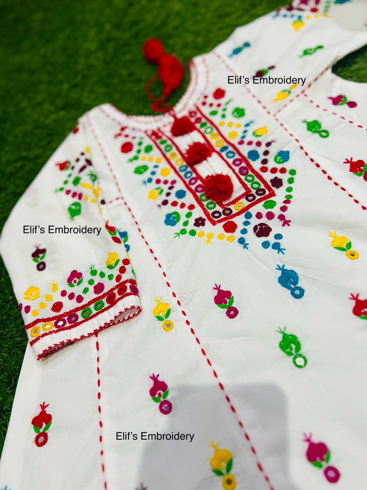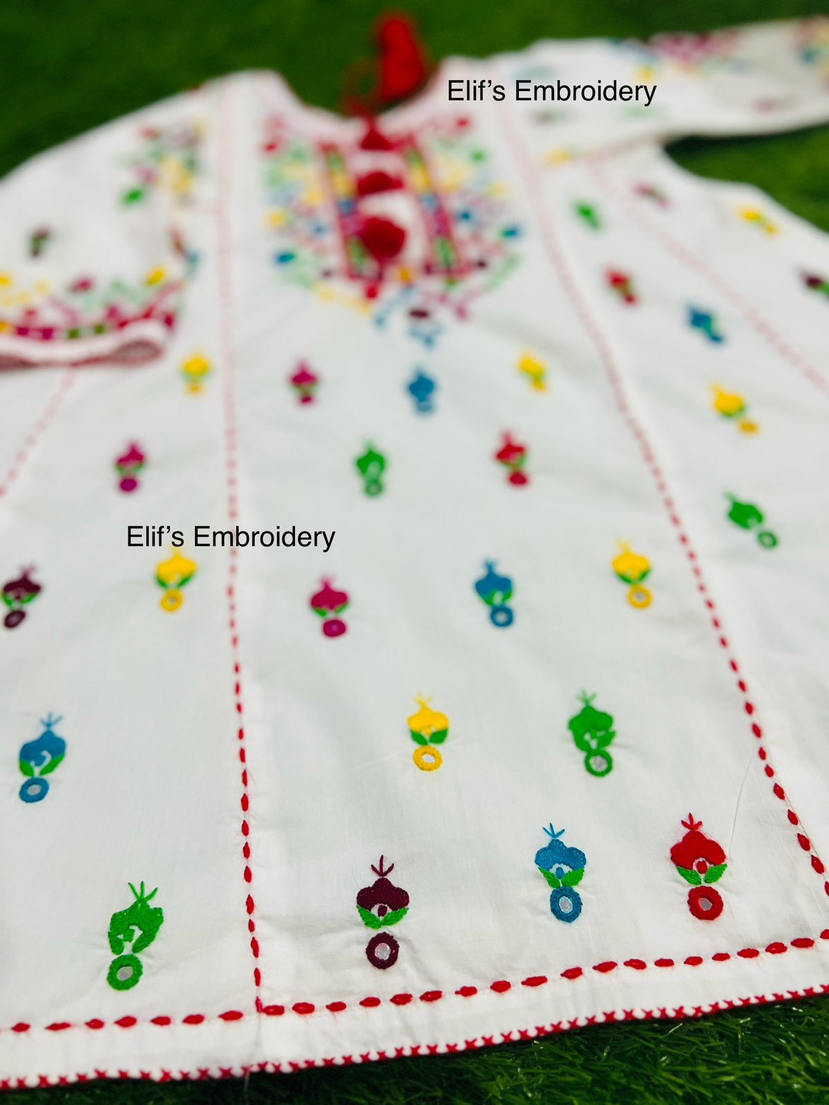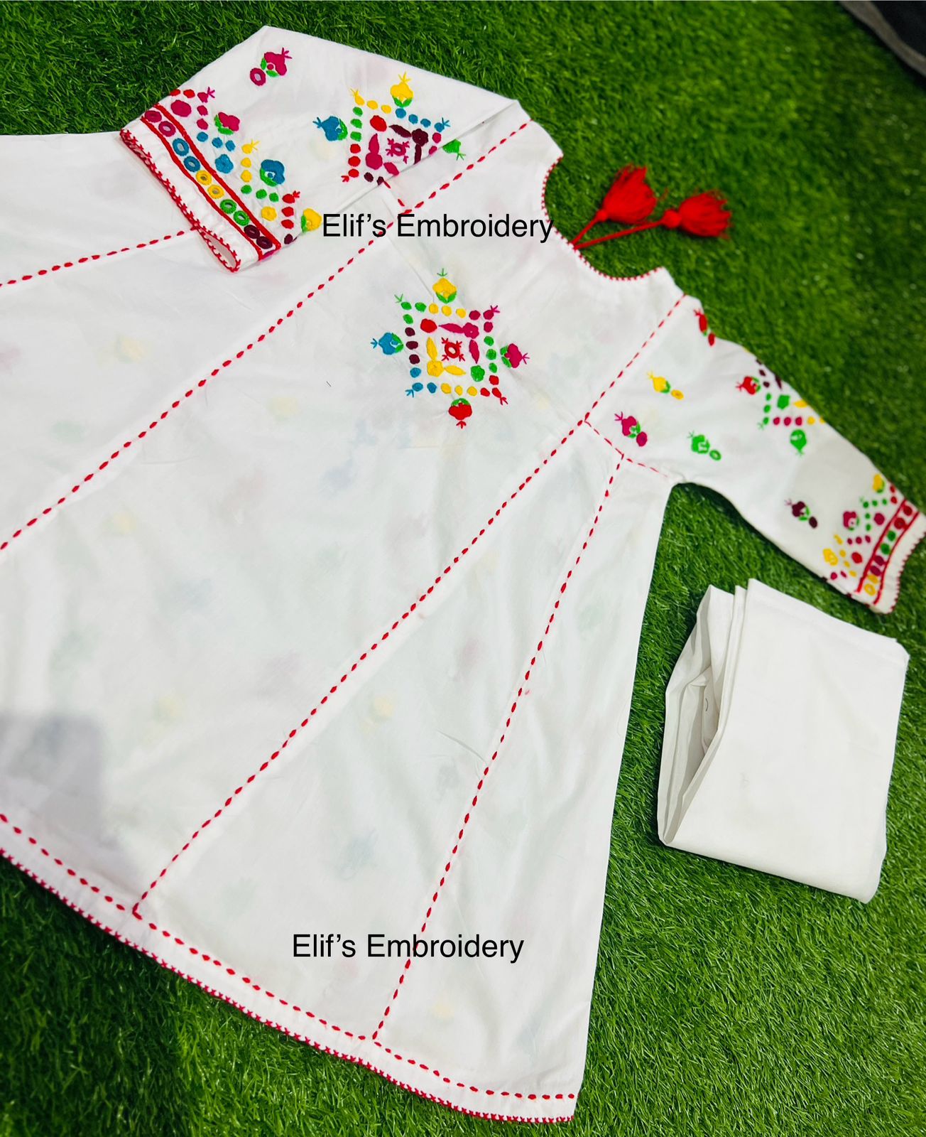 This Ayat - Kids frock features delicate, hand embroidery in vibrant multi-color for a unique and stylish look. Crafted with a crisp white fabric, this suit is perfect for any occasion and will make your child stand out. Elevate their style with this elegant yet playful design.