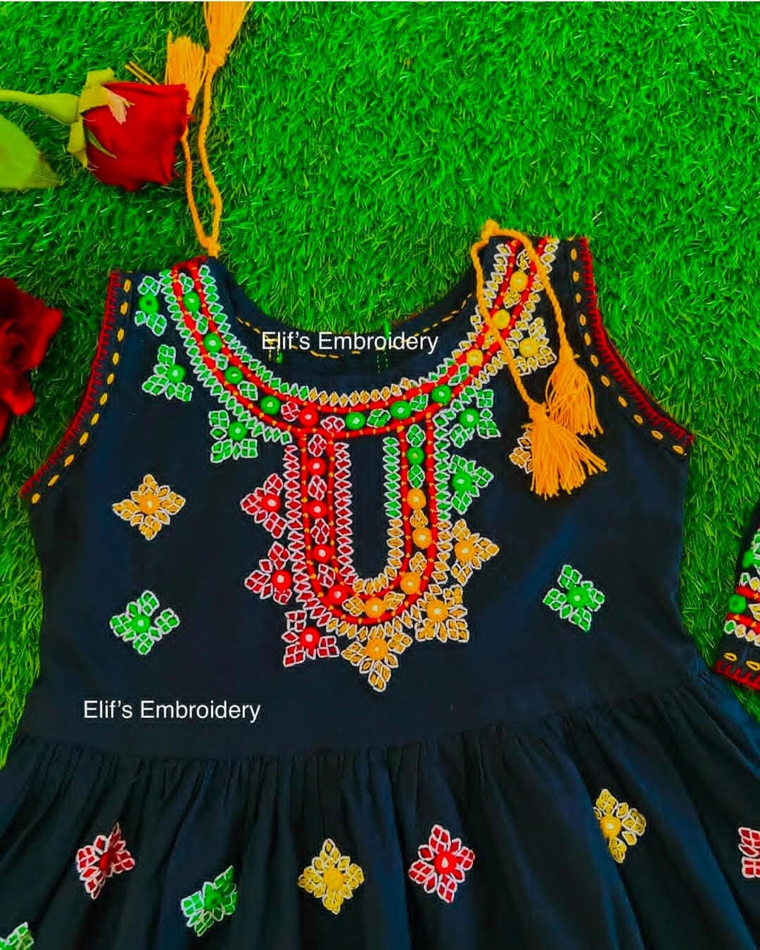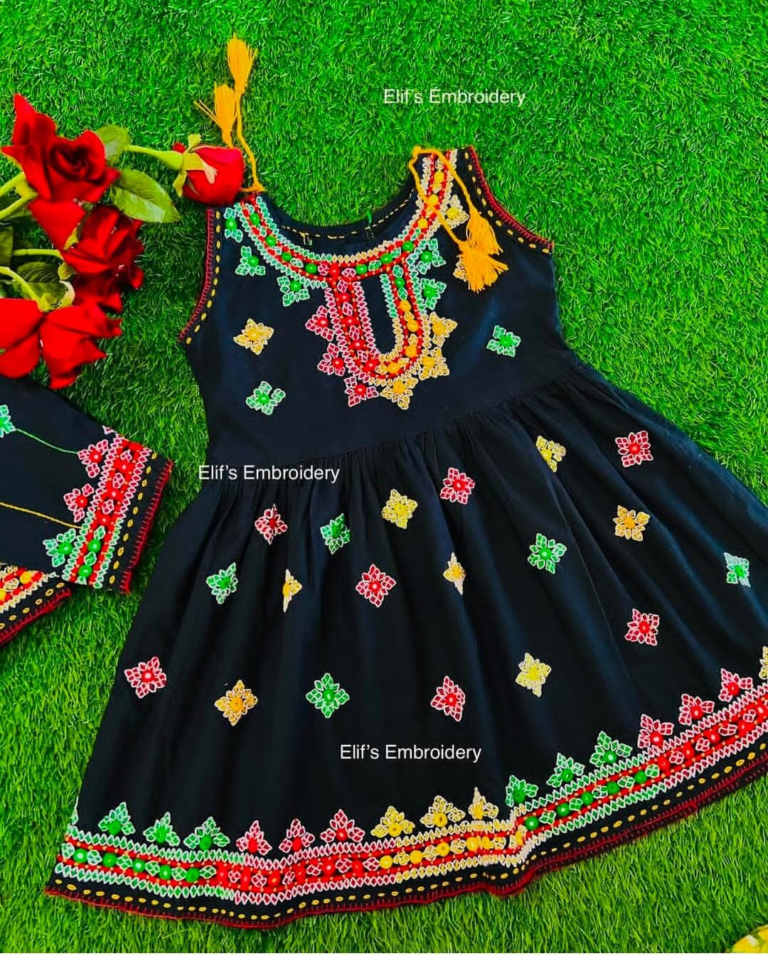 This premium Bakhtawar children's black suit features exquisite multicolored embroidery, meticulously handcrafted using traditional techniques. The striking contrast between the elegant black fabric and vibrant embroidery patterns creates a sophisticated yet playful aesthetic. Expertly tailored for comfort and durability, this garment combines cultural artistry with practical design elements suitable for special occasions.