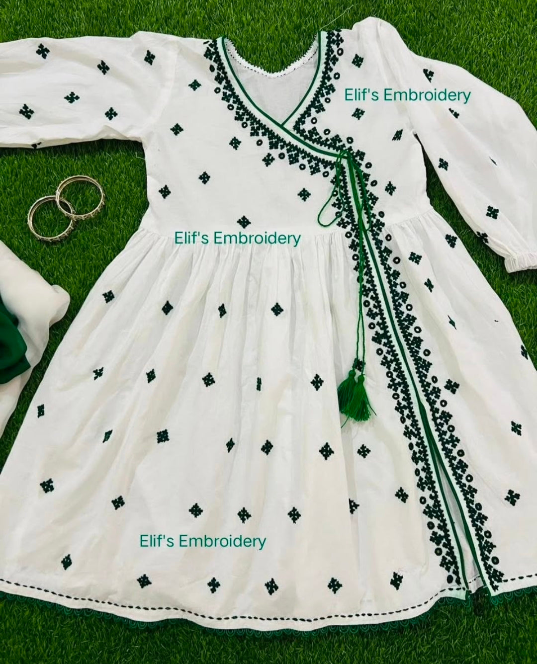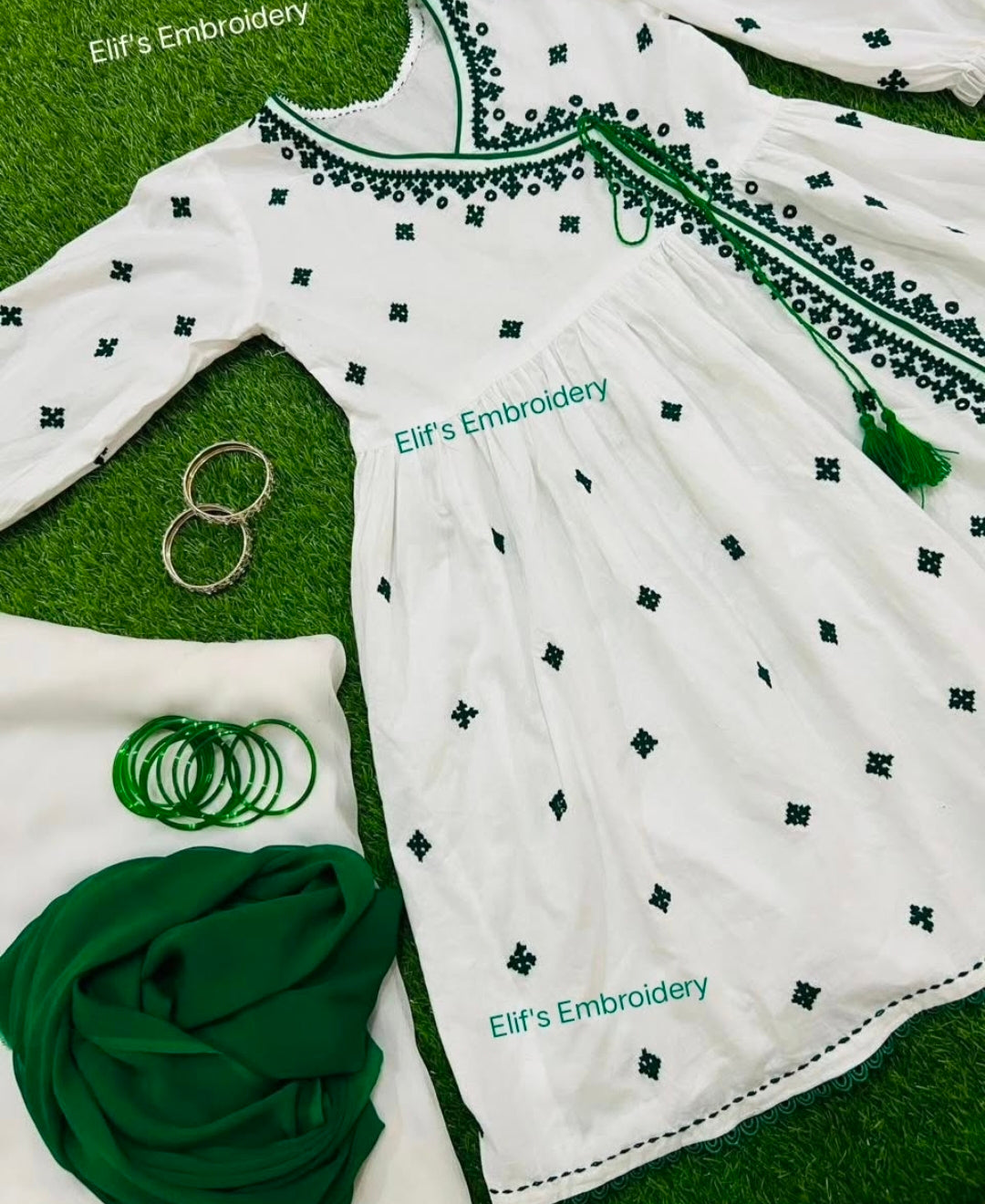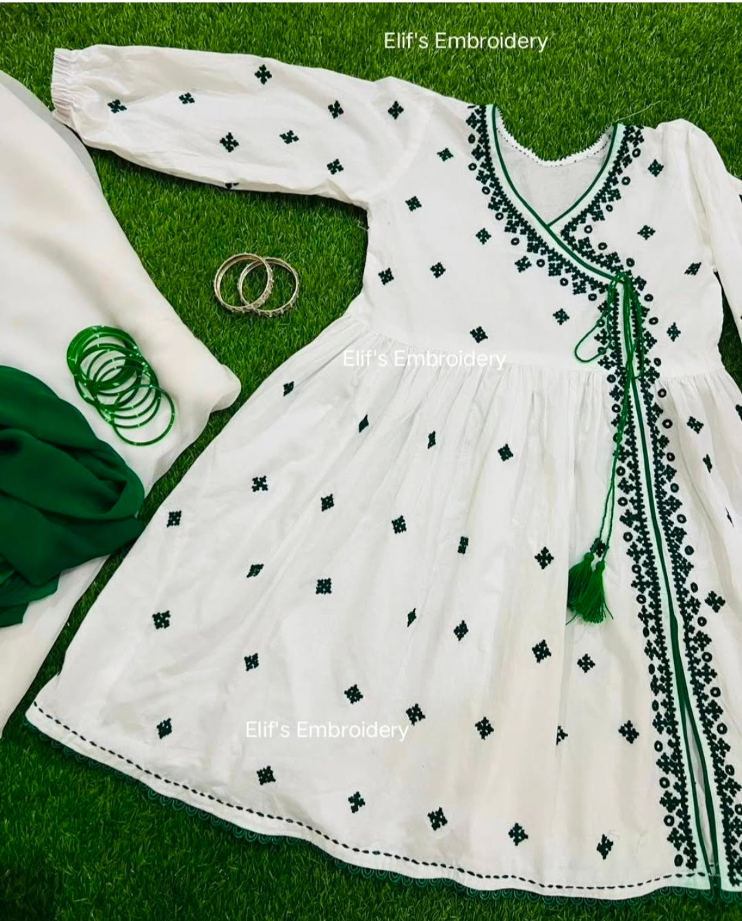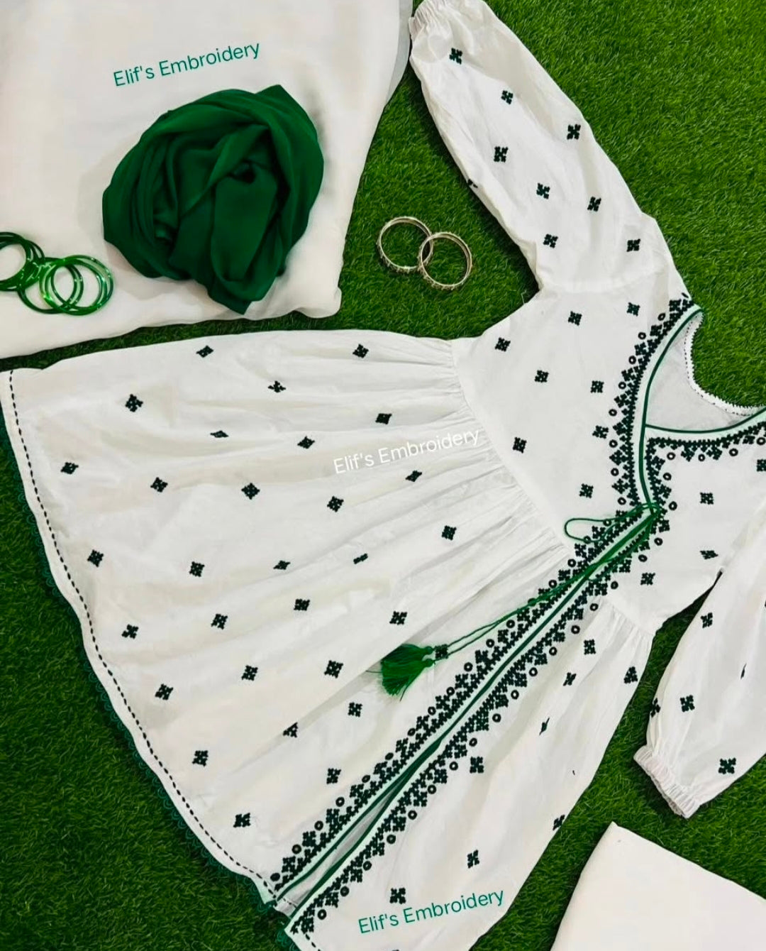 Celebrate the spirit of freedom with this charming hand-embroidered kids' frock, specially designed for 14th August. Featuring patriotic green and white tones, delicate embroidery, and soft, breathable fabric, this frock is perfect for little ones to shine at school functions, family gatherings, or flag-hoisting events. Handmade with love to reflect pride and tradition.