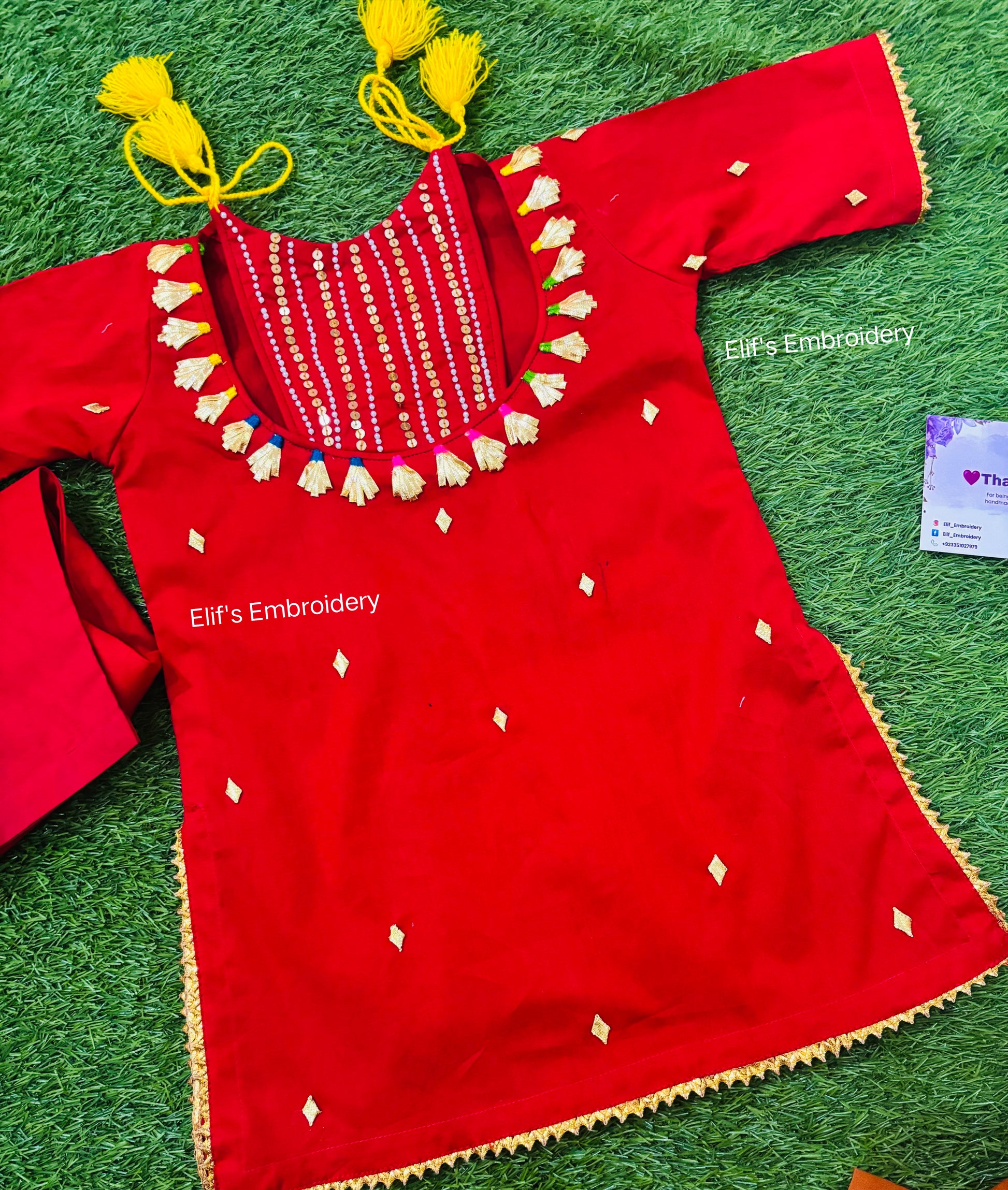 The Gul Rukh - Kids suit is expertly hand embroidered in vibrant red, creating a stunning and unique look for your child. Made with high-quality materials, this suit is both stylish and durable. Elevate your child's wardrobe with this one-of-a-kind piece.