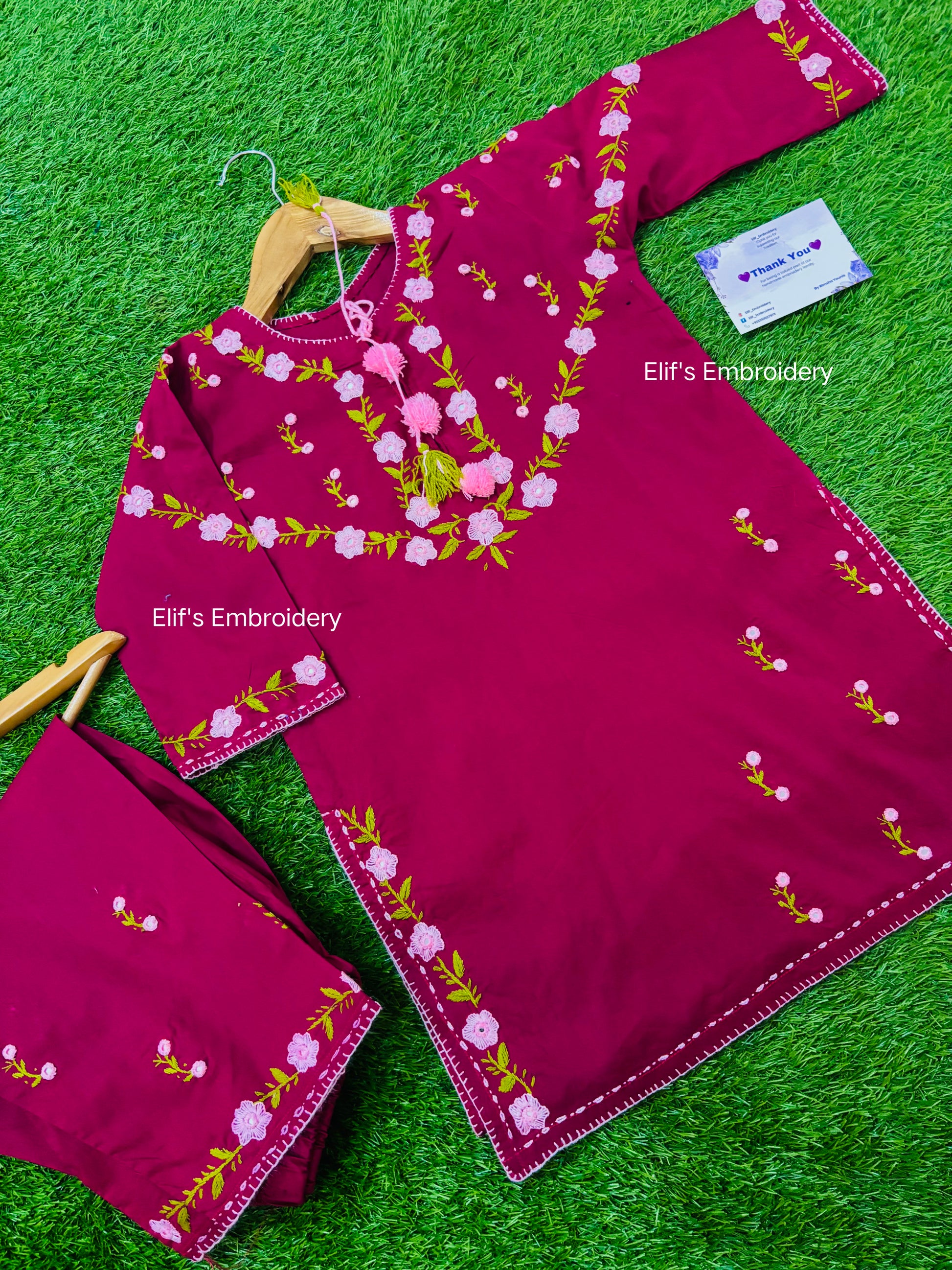 Expertly hand-embroidered in a beautiful maroon color, the Jenna Kids suit is a must-have for any fashionable child. Crafted with precision and care, this suit is perfect for special occasions and offers a touch of elegance to any outfit.