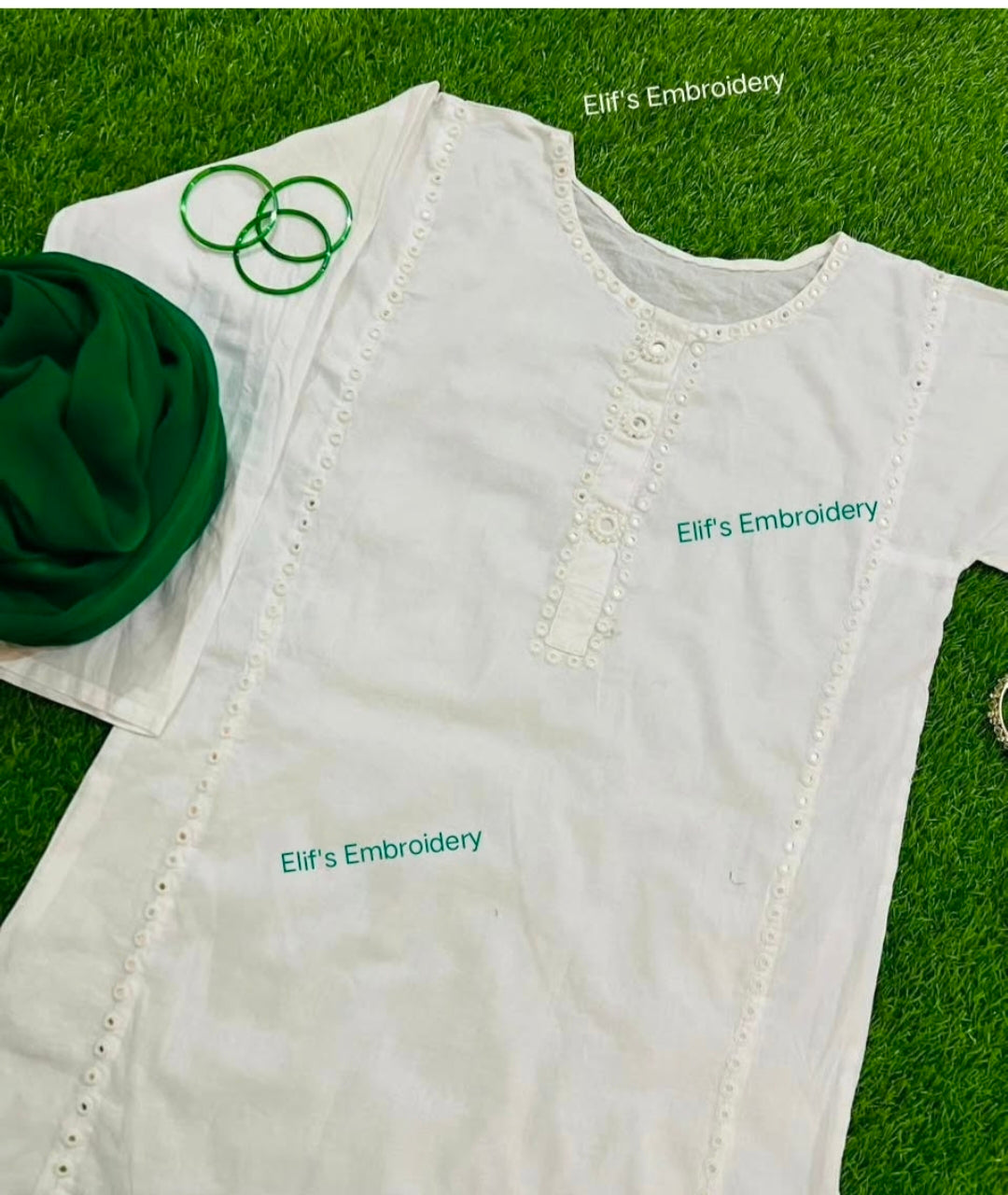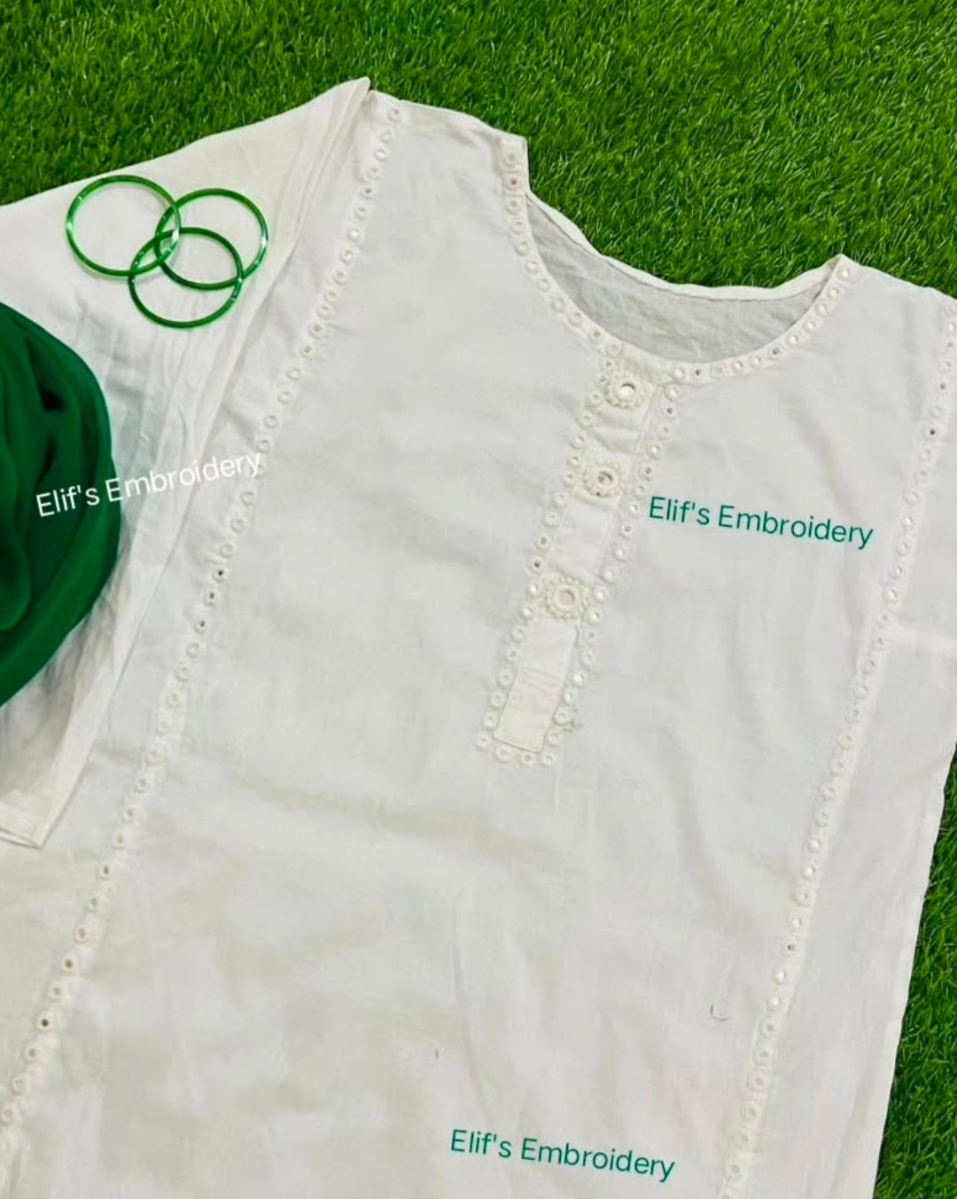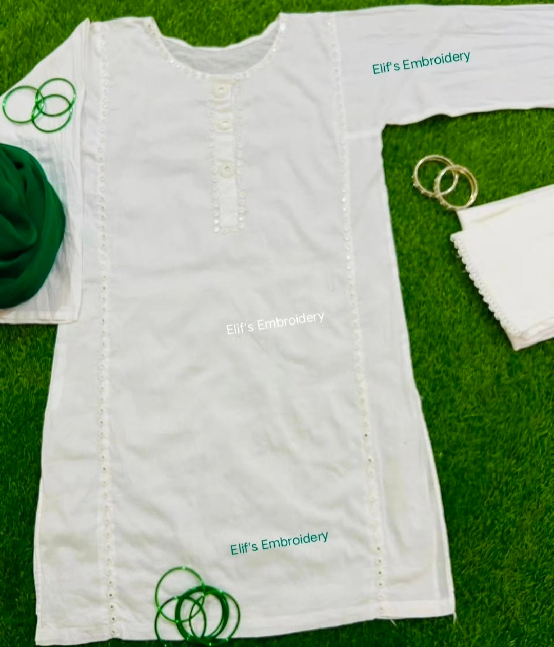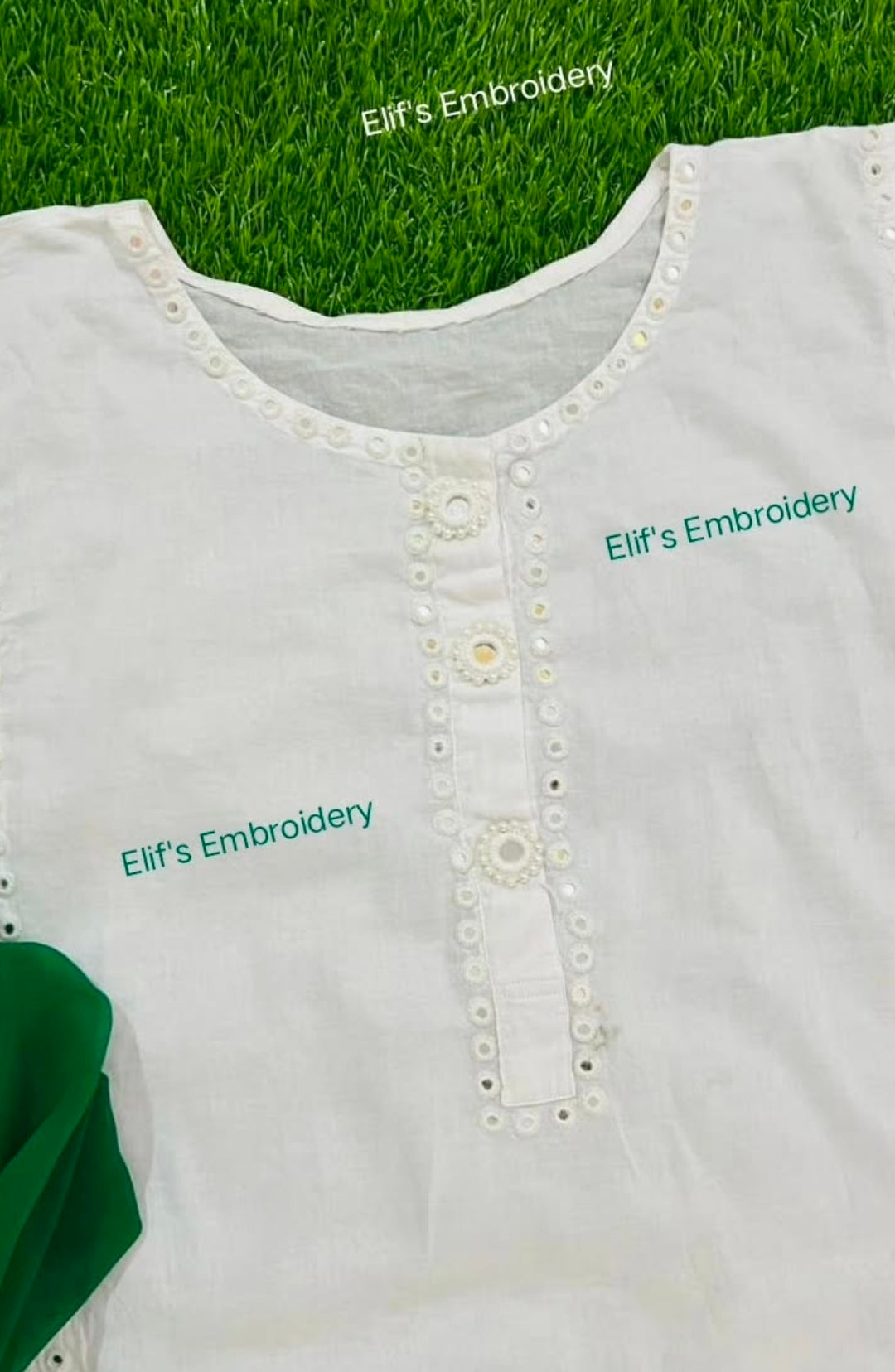 Celebrate 14th August in timeless style with this elegant handmade white suit, adorned with delicate mirror work in suit-matching tones. Inspired by the purity and pride of Pakistan, this outfit combines tradition with modern craftsmanship. Perfect for school events, Independence Day functions, or festive gatherings, it reflects national spirit with grace.