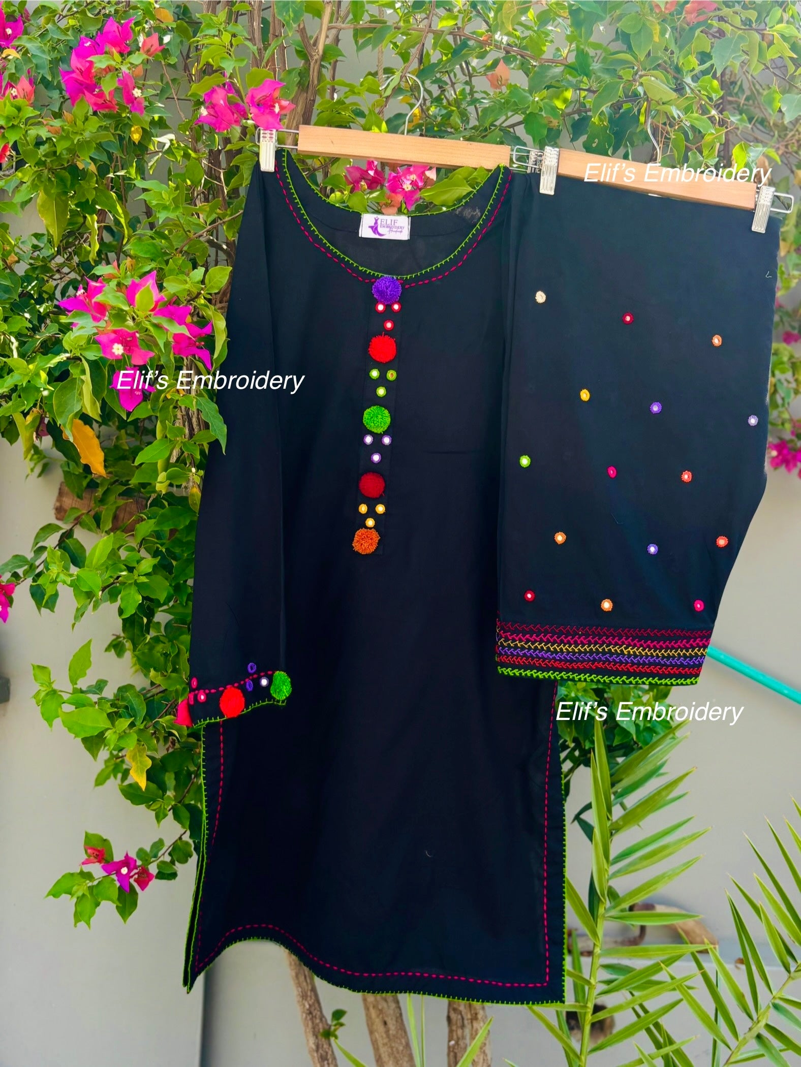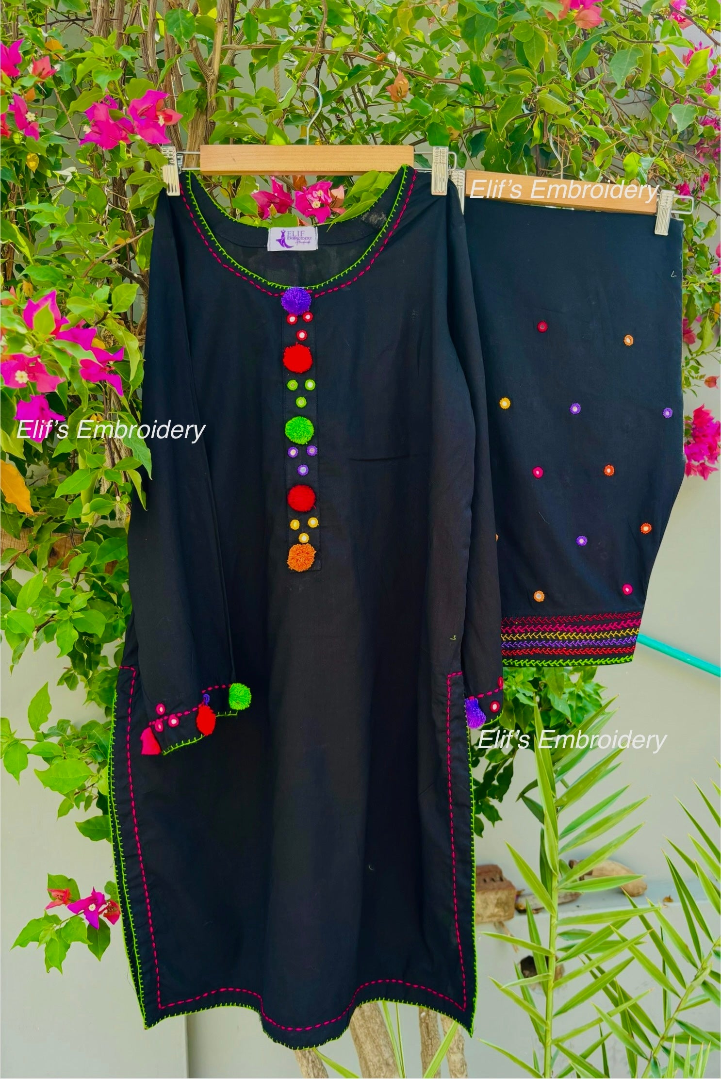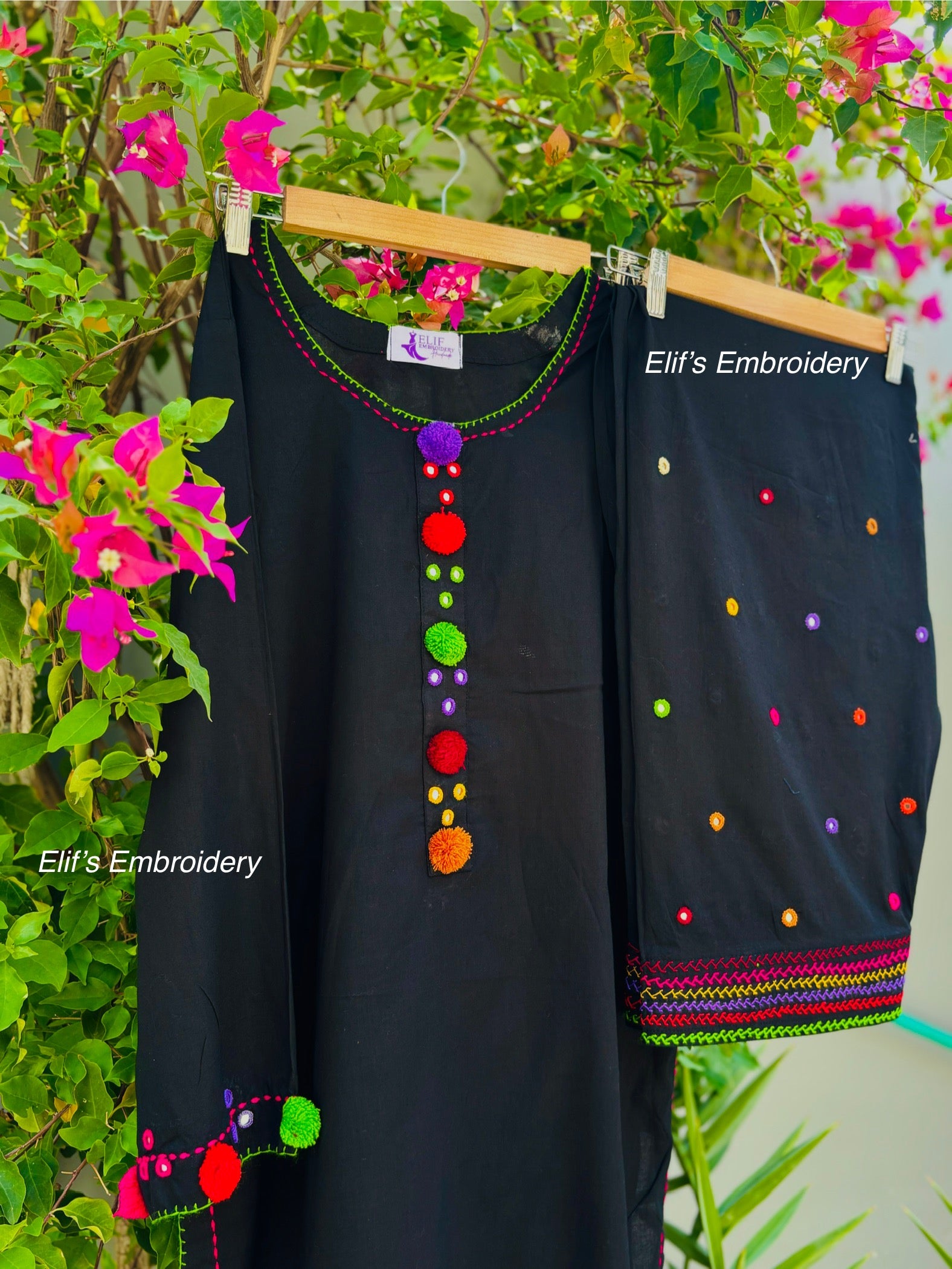 This exquisite hand embroidered black suit combined with vibrant multicolored mirror work, creating a striking contrast that highlights intricate craftsmanship.