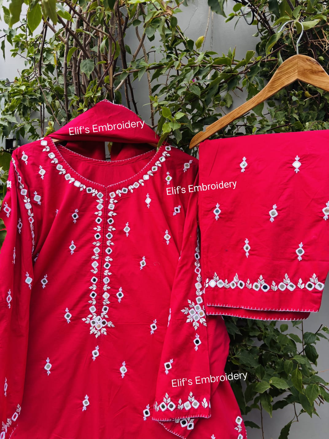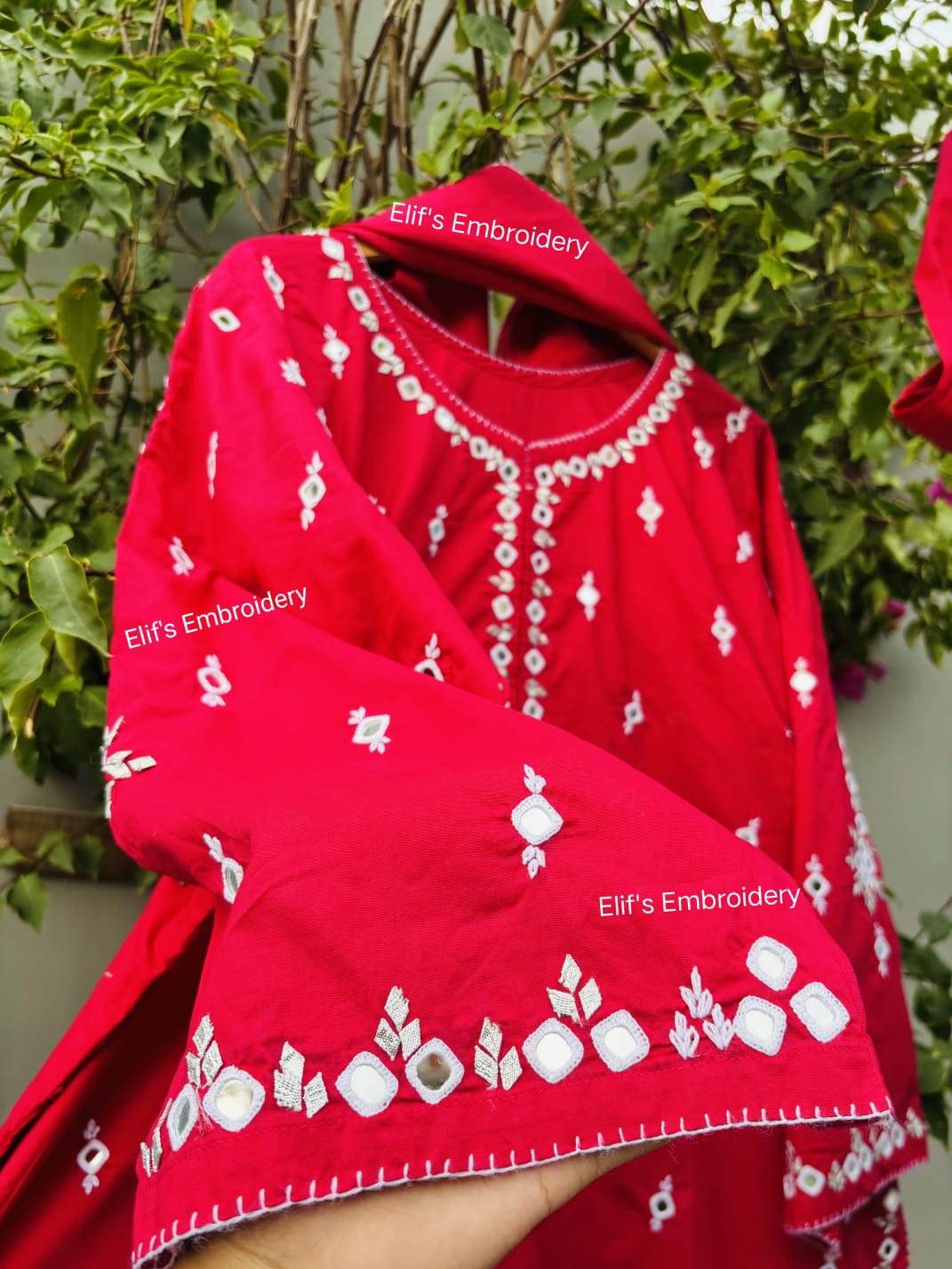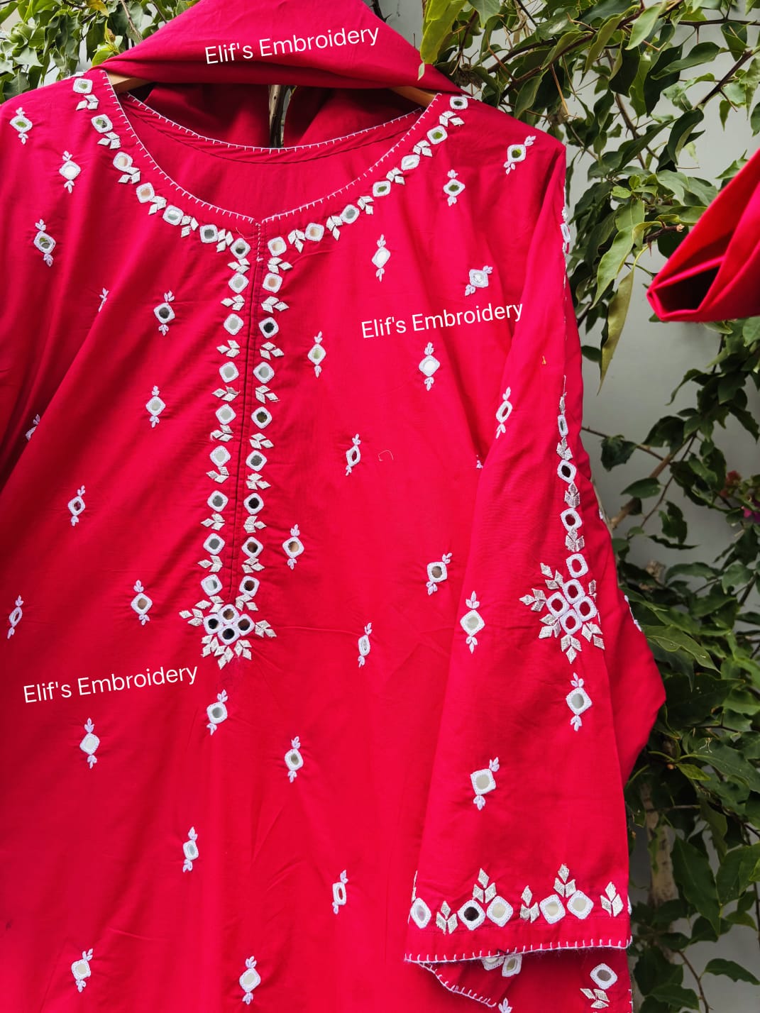 Drape yourself in timeless elegance with this stunning hand-embroidered red suit, adorned with intricate mirror work that reflects tradition and artistry. Crafted with fine attention to detail, this suit features delicate thread embroidery, shimmering mirrors, and rich red fabric — a classic symbol of festivity and celebration in South Asian culture.