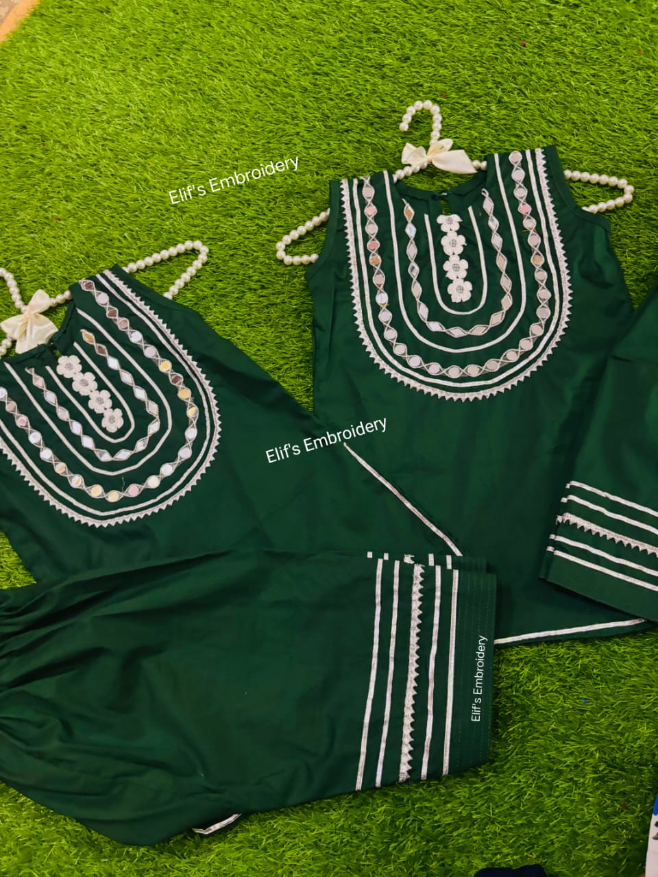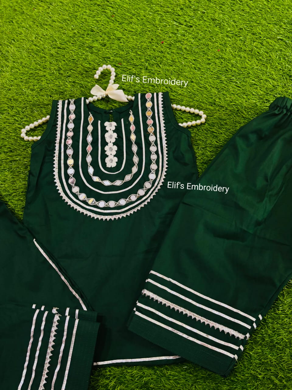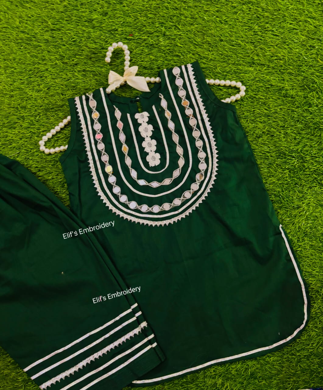Grace meets tradition in this elegant green hand-embroidered suit, adorned with delicate kanari (gota/kinari) work for a rich, festive look.
