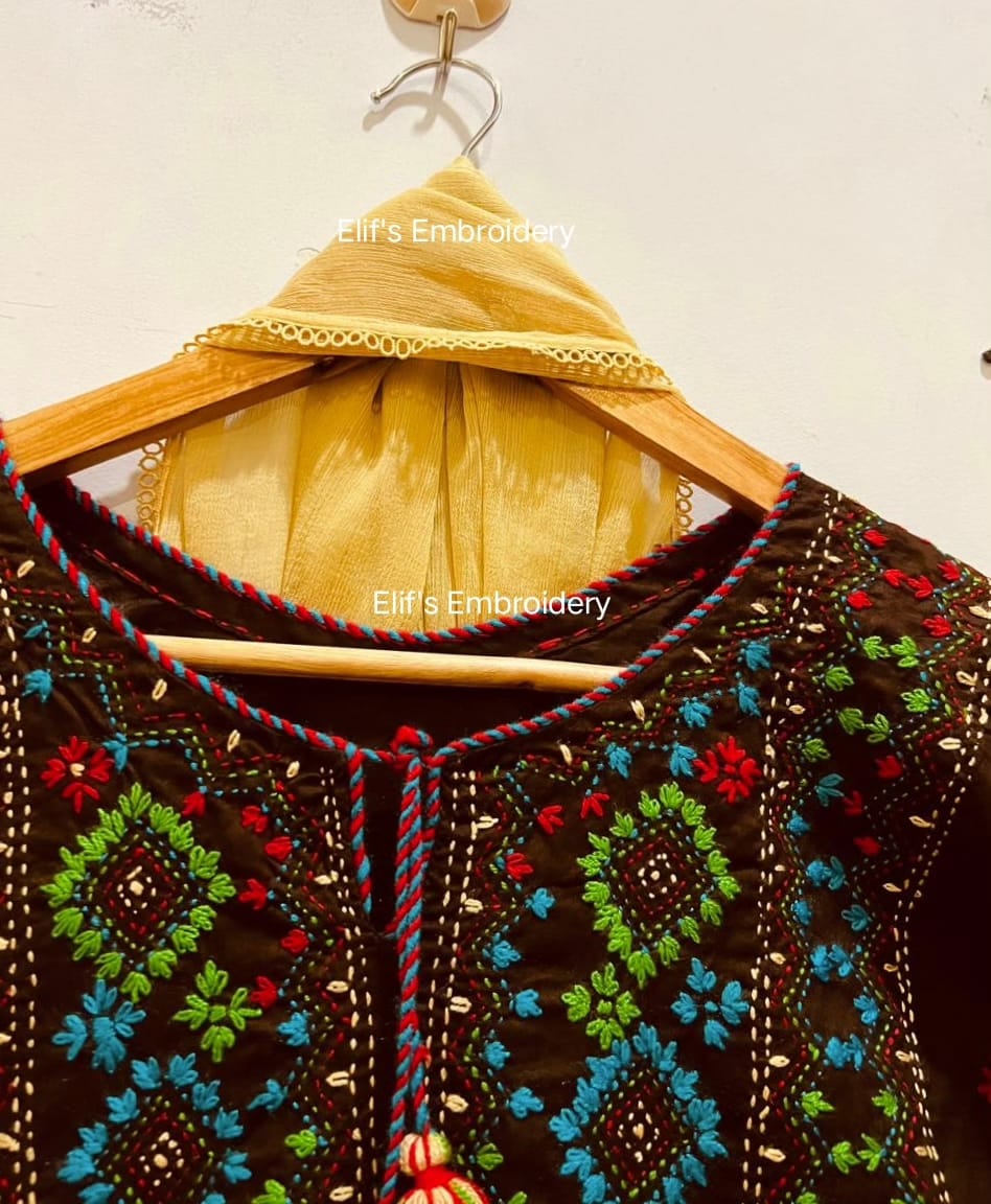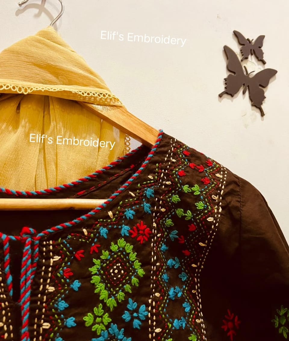 Expertly hand-embroidered, the Rayhana 3Pc Suit boasts rich brown coloring for a sophisticated look. The intricate embroidering adds a touch of elegance and sophistication, making this suit perfect for special occasions or everyday wear. Crafted with precision, this suit is a must-have for the stylish and fashion-forward individual.