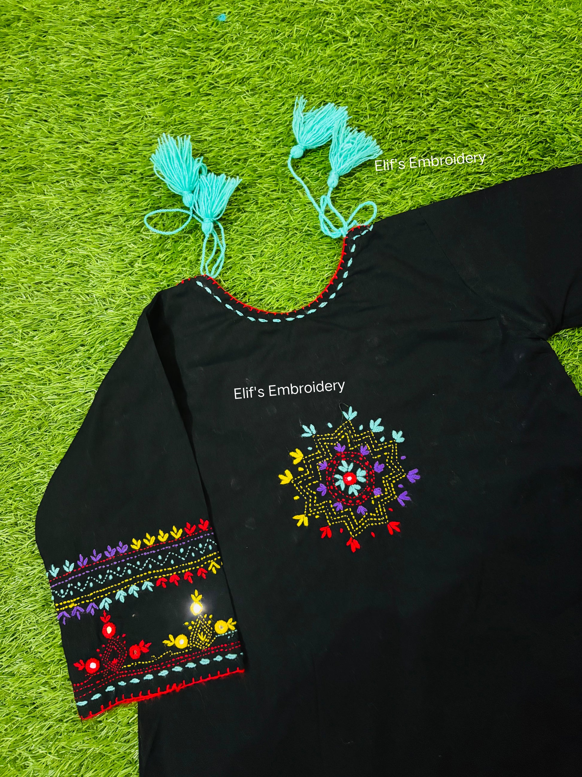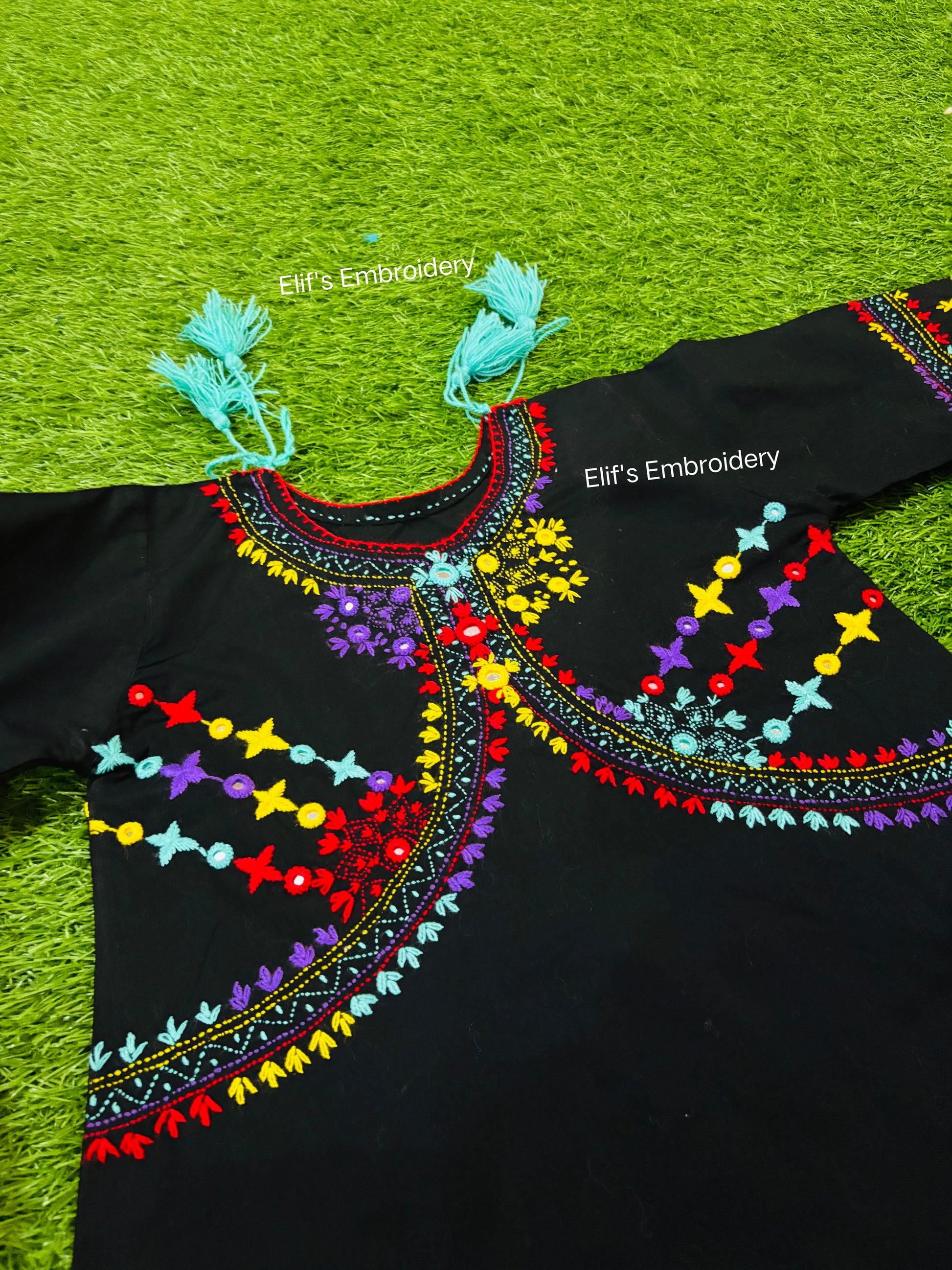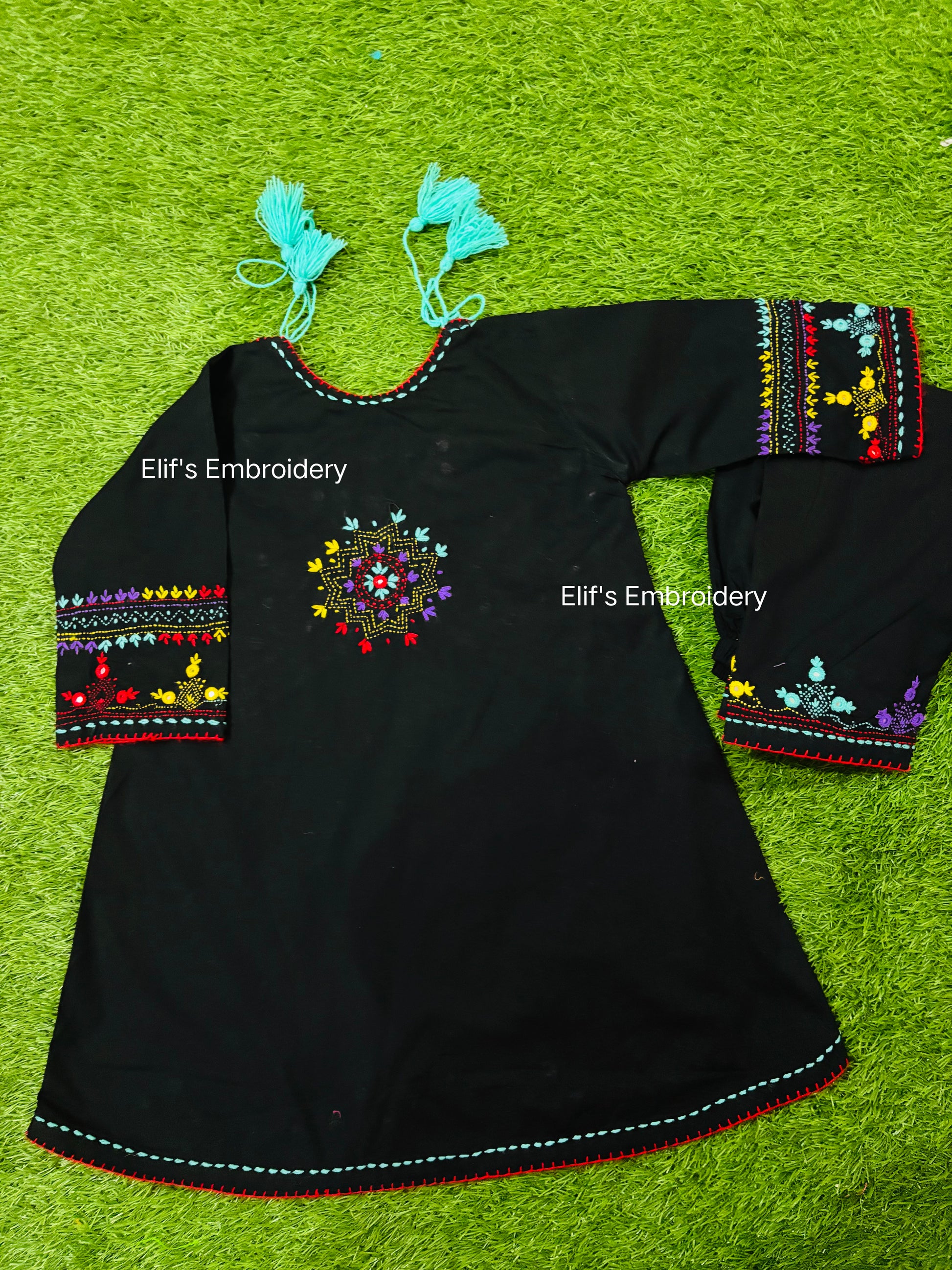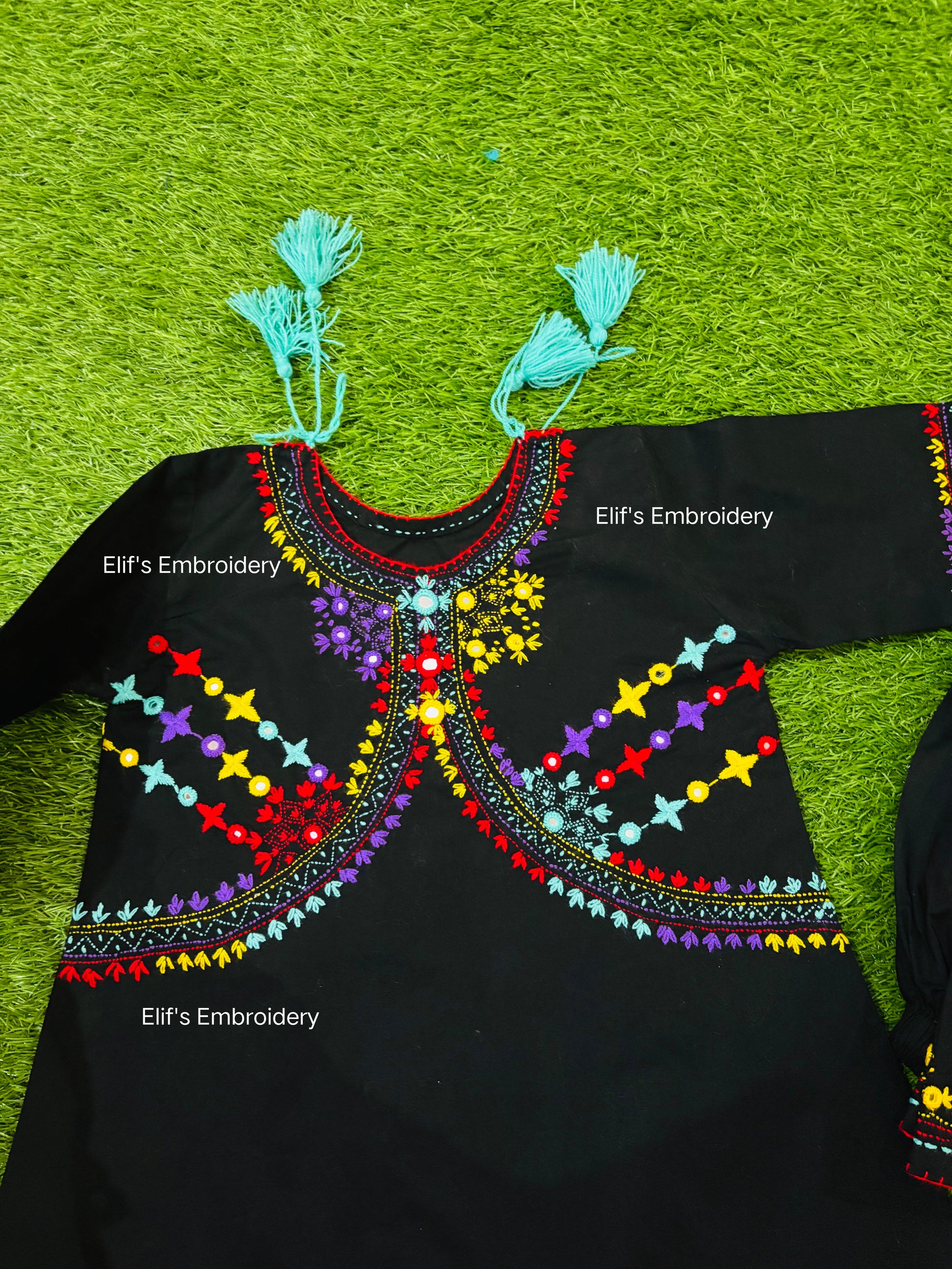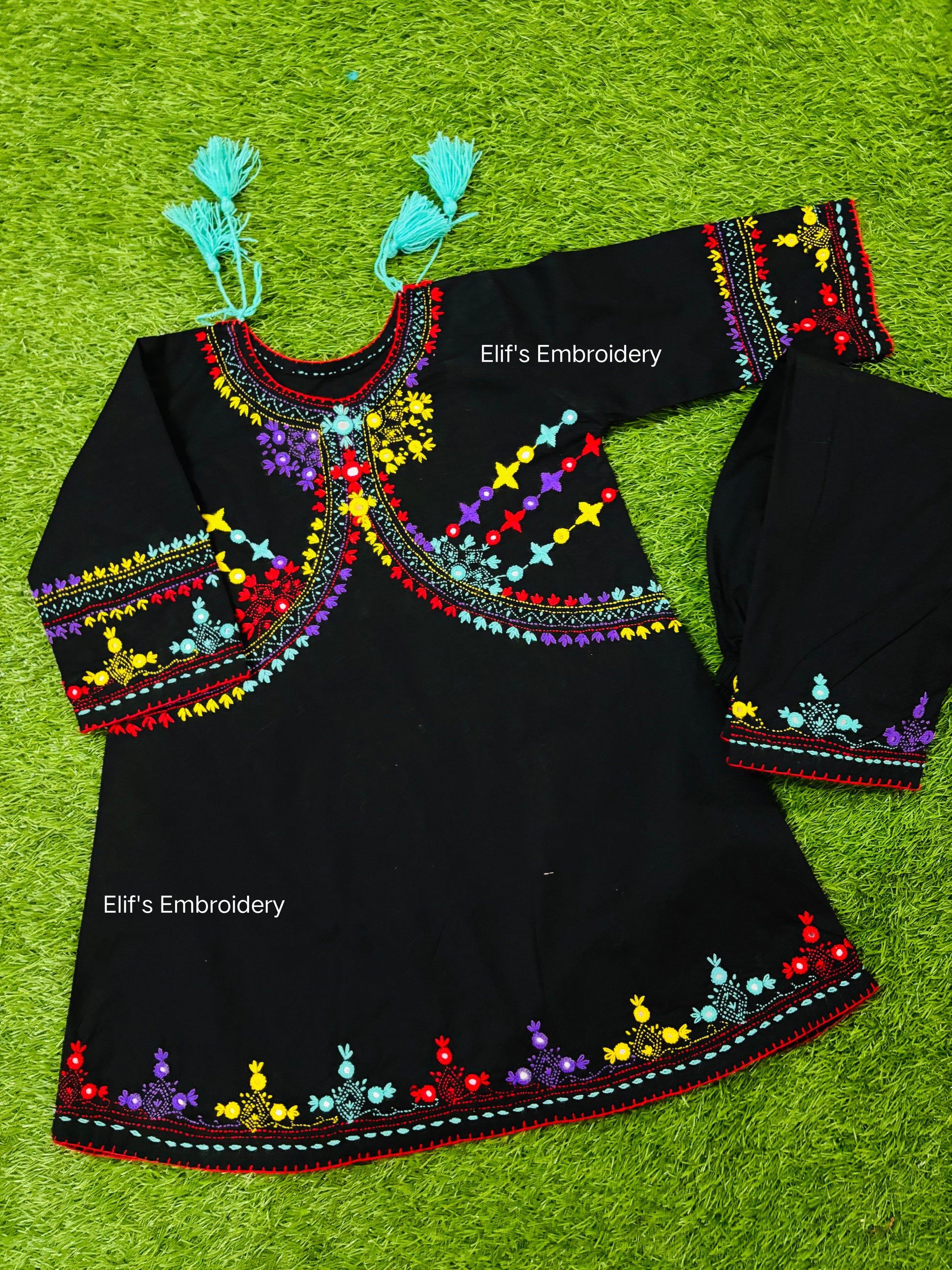 Introduce your child to sophistication with the Reem Kids black suit. This stylish outfit features intricate multicolored hand embroidery, adding a touch of elegance and charm. Perfect for formal occasions or dressing up, your child will feel confident and stylish in this well-made suit.