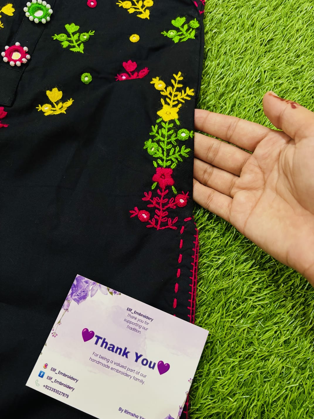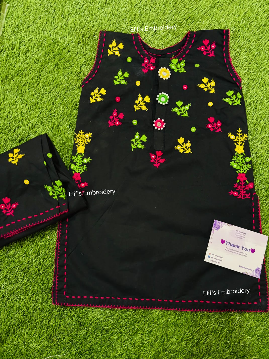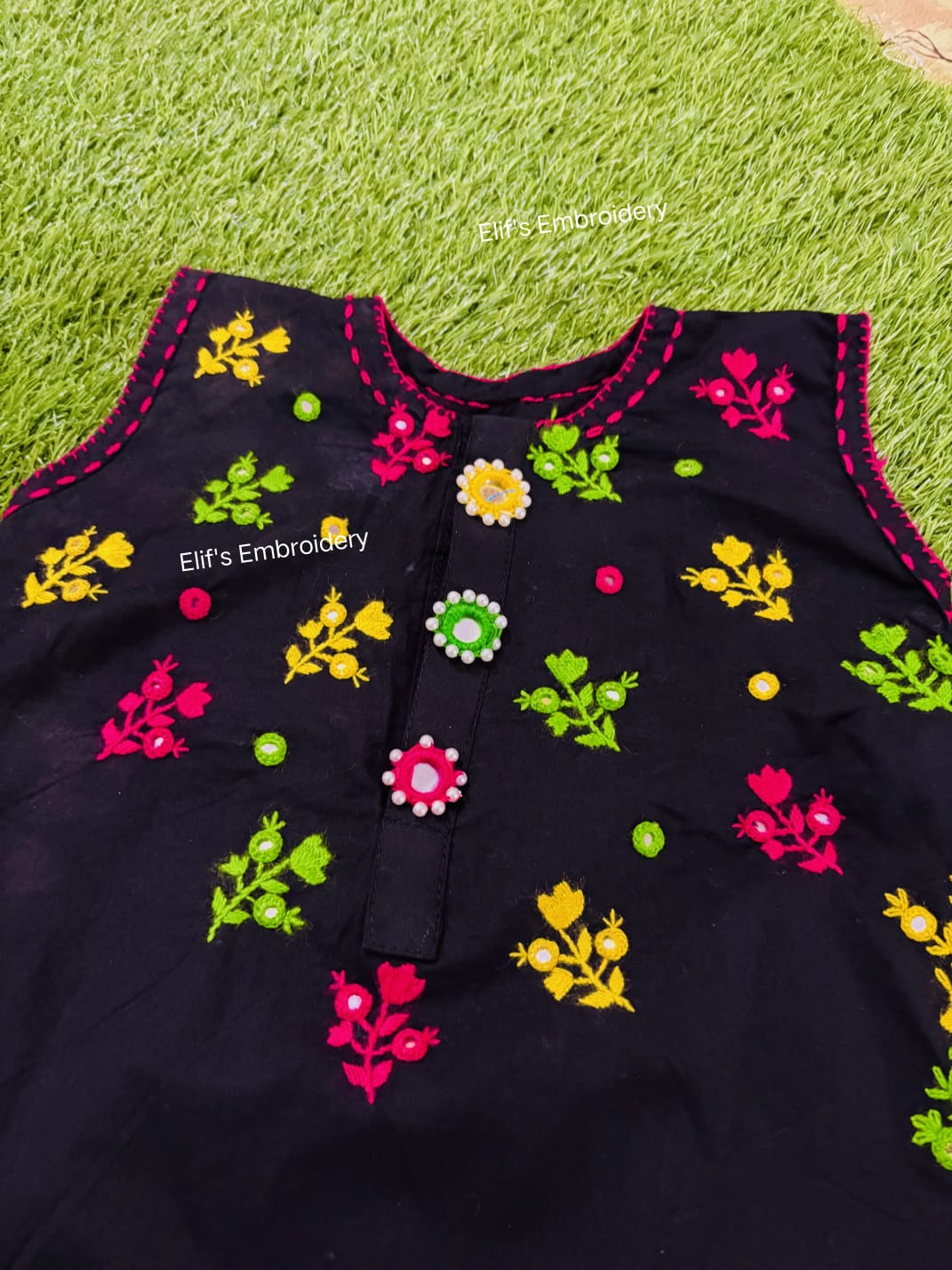 This black-colored kids' dress by Rimsh features hand-embroidered details and sleeveless design. Perfect for any occasion, it offers comfort and style to your little one's wardrobe. Made with high-quality materials, it is sure to last and make your child stand out.