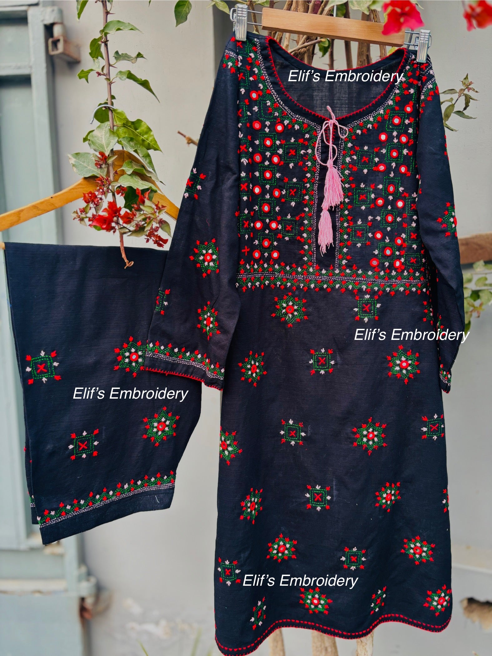 Zahrah is a sophisticated two-piece hand-embroidered suit in classic black, showcasing meticulous craftsmanship. Each piece features intricate embroidery work executed by skilled artisans, combining traditional techniques with contemporary design. The suit offers versatility for both formal occasions and elevated everyday wear. Crafted with attention to detail, this ensemble reflects the quality and artistry that defines Elif Embroidery Handmade's collection.