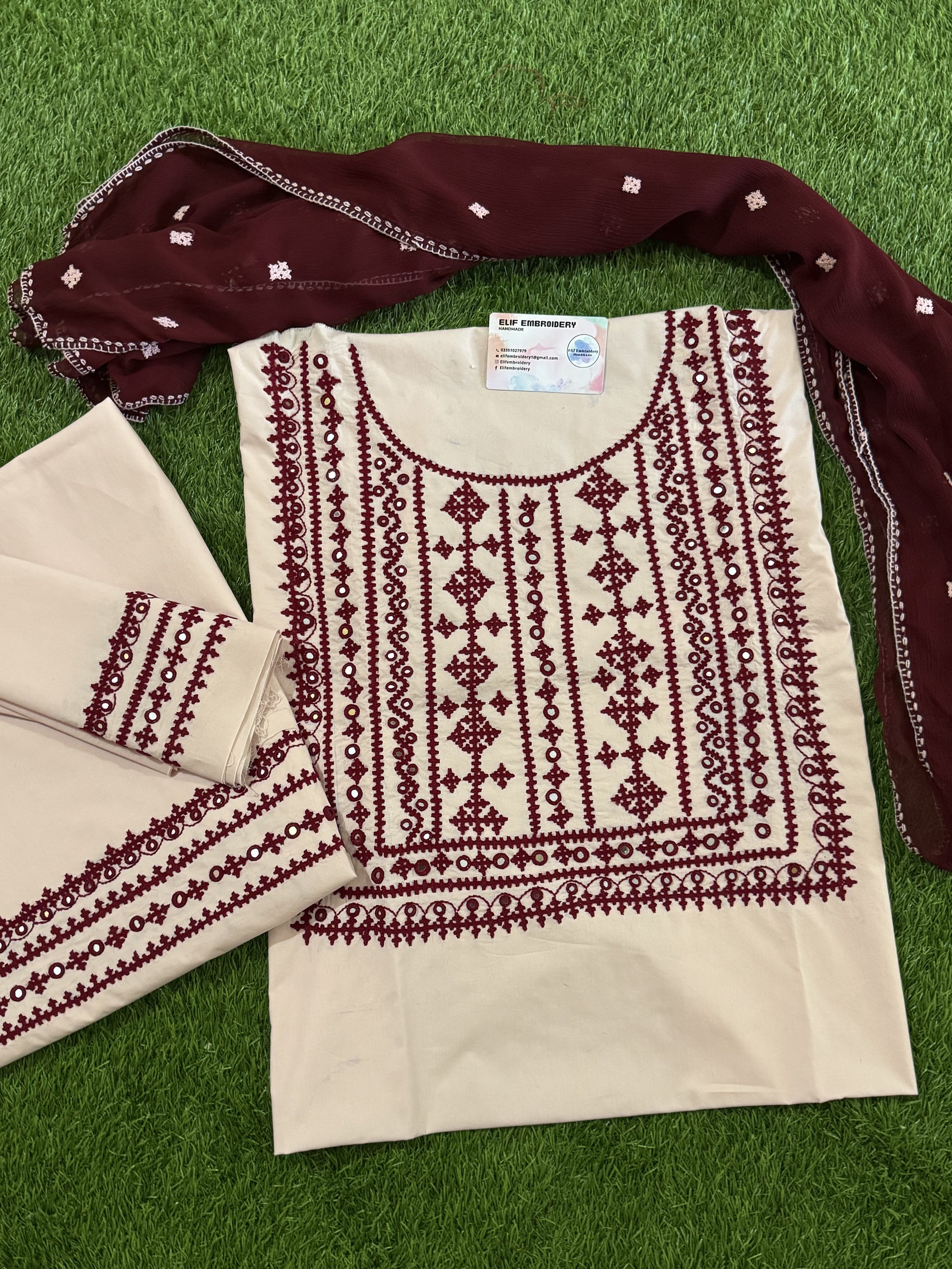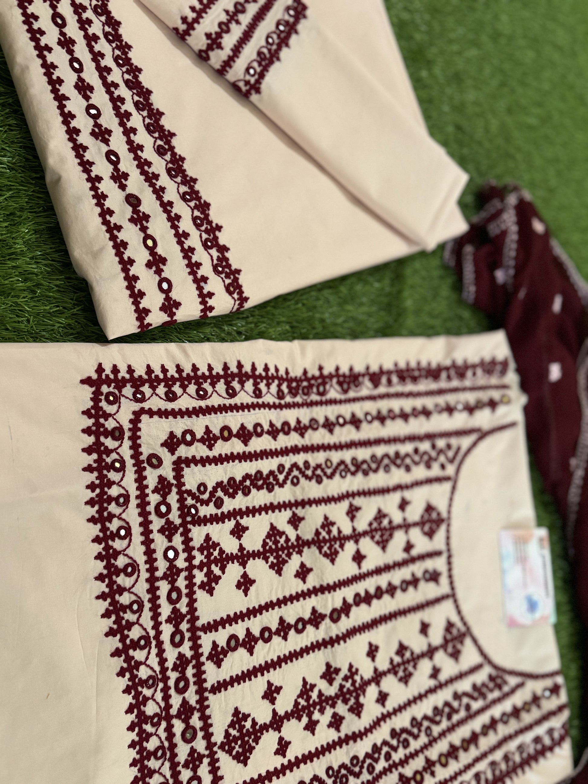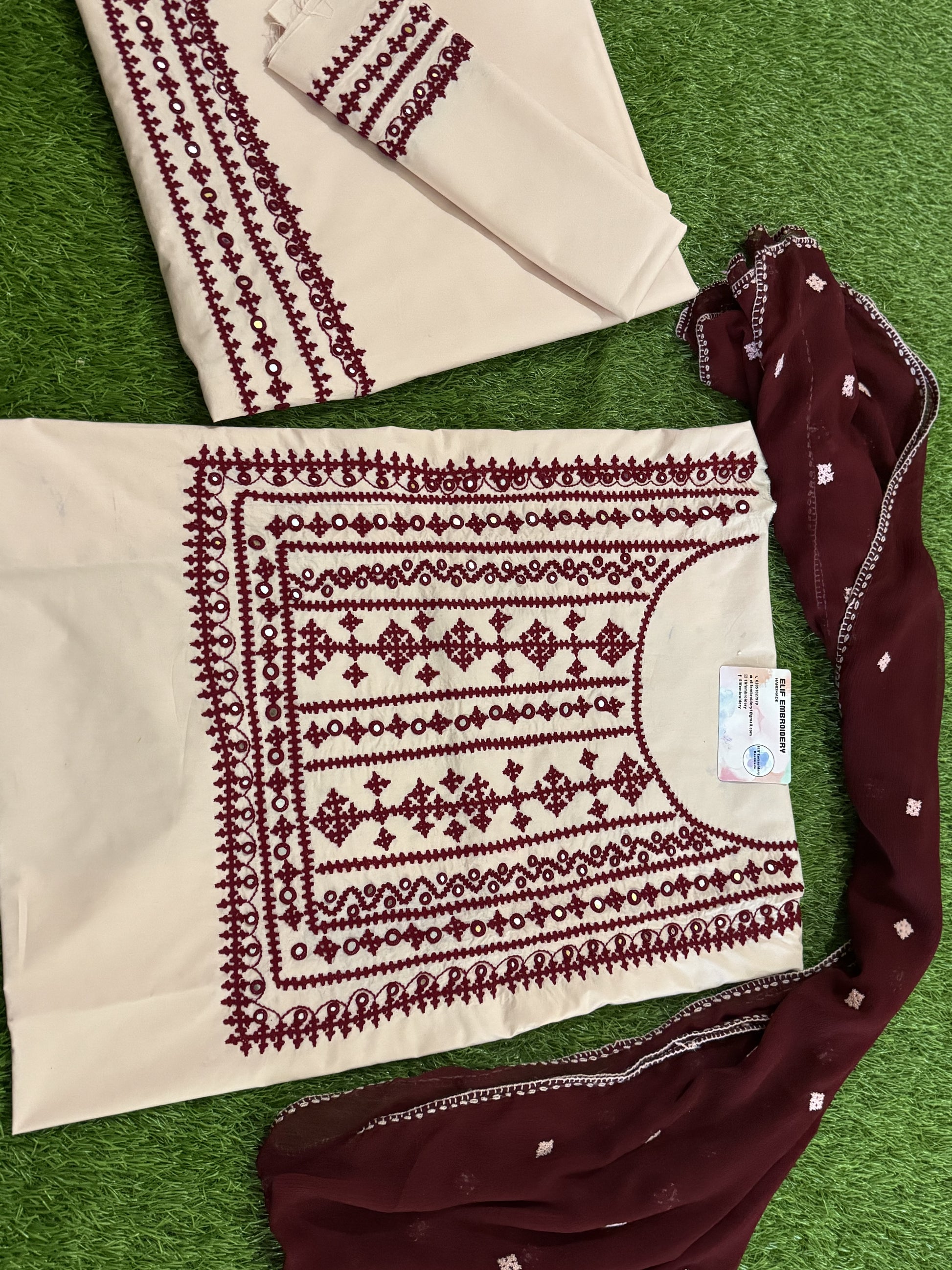 This exquisite hand embroidered suit is a must-have for any fashion enthusiast. With intricate mehroon embroidery on a skin colored base, it exudes elegance and grace. Elevate your style with this beautifully Hand crafted piece that is perfect for any occasion. Expertly made with precision and attention to detail, this suit will surely make a statement.