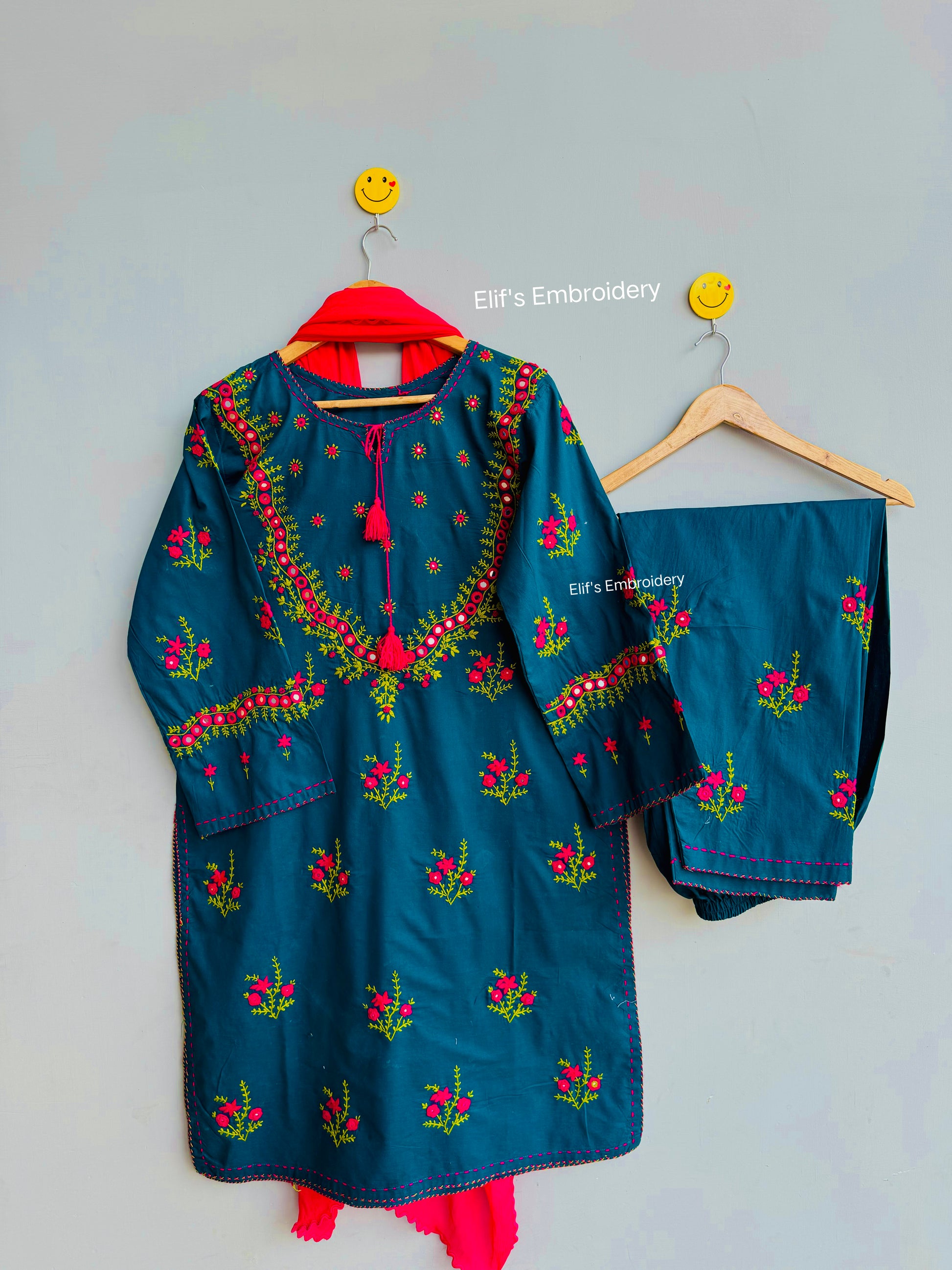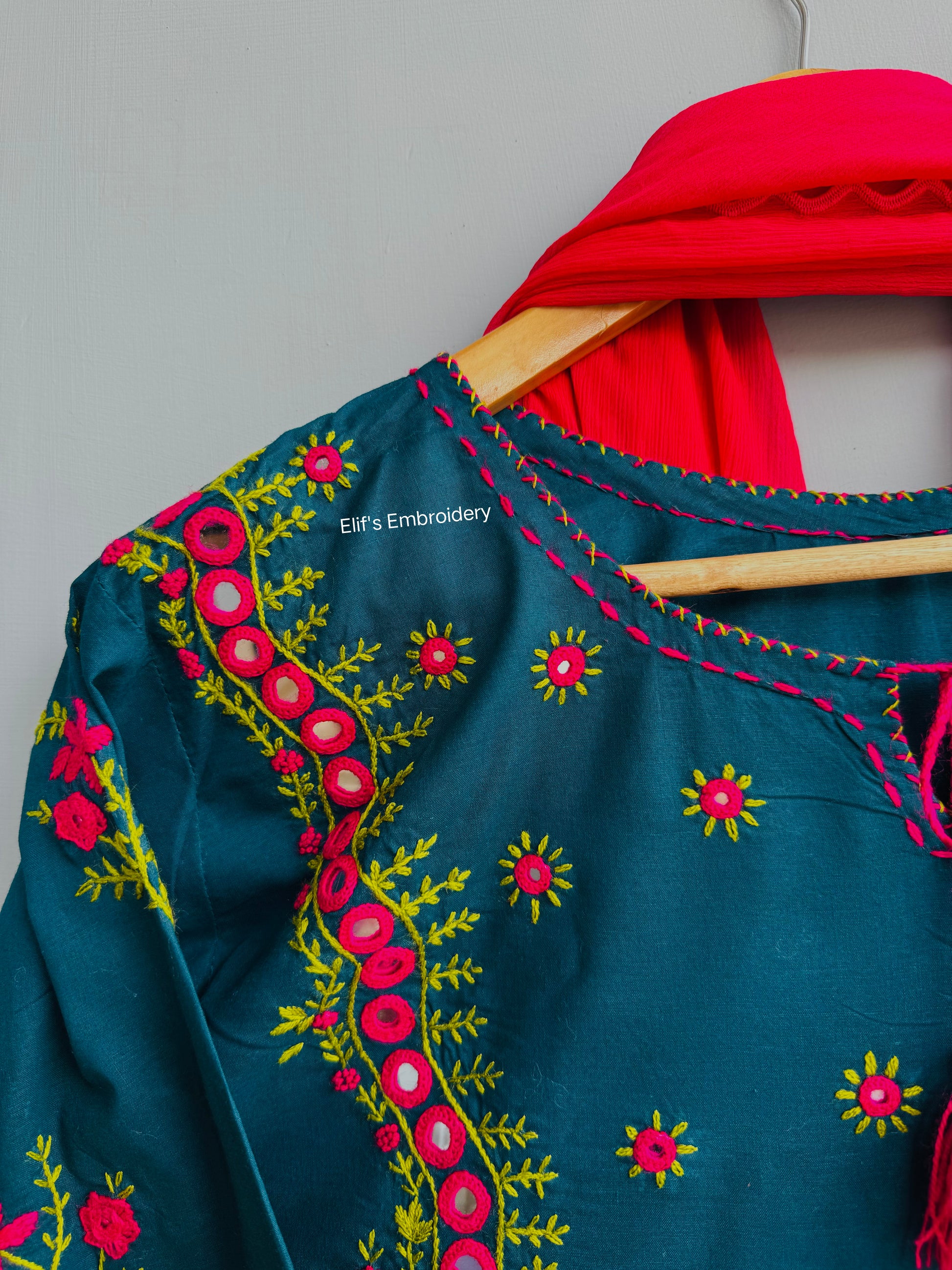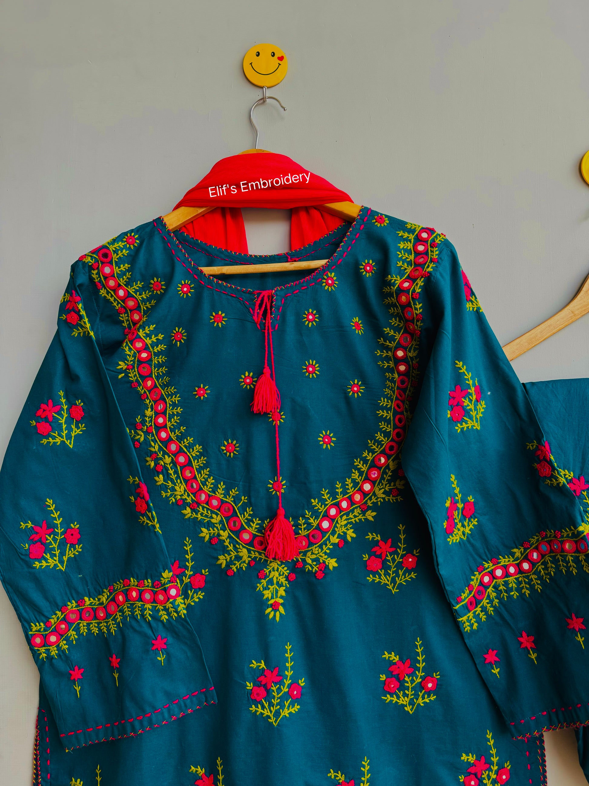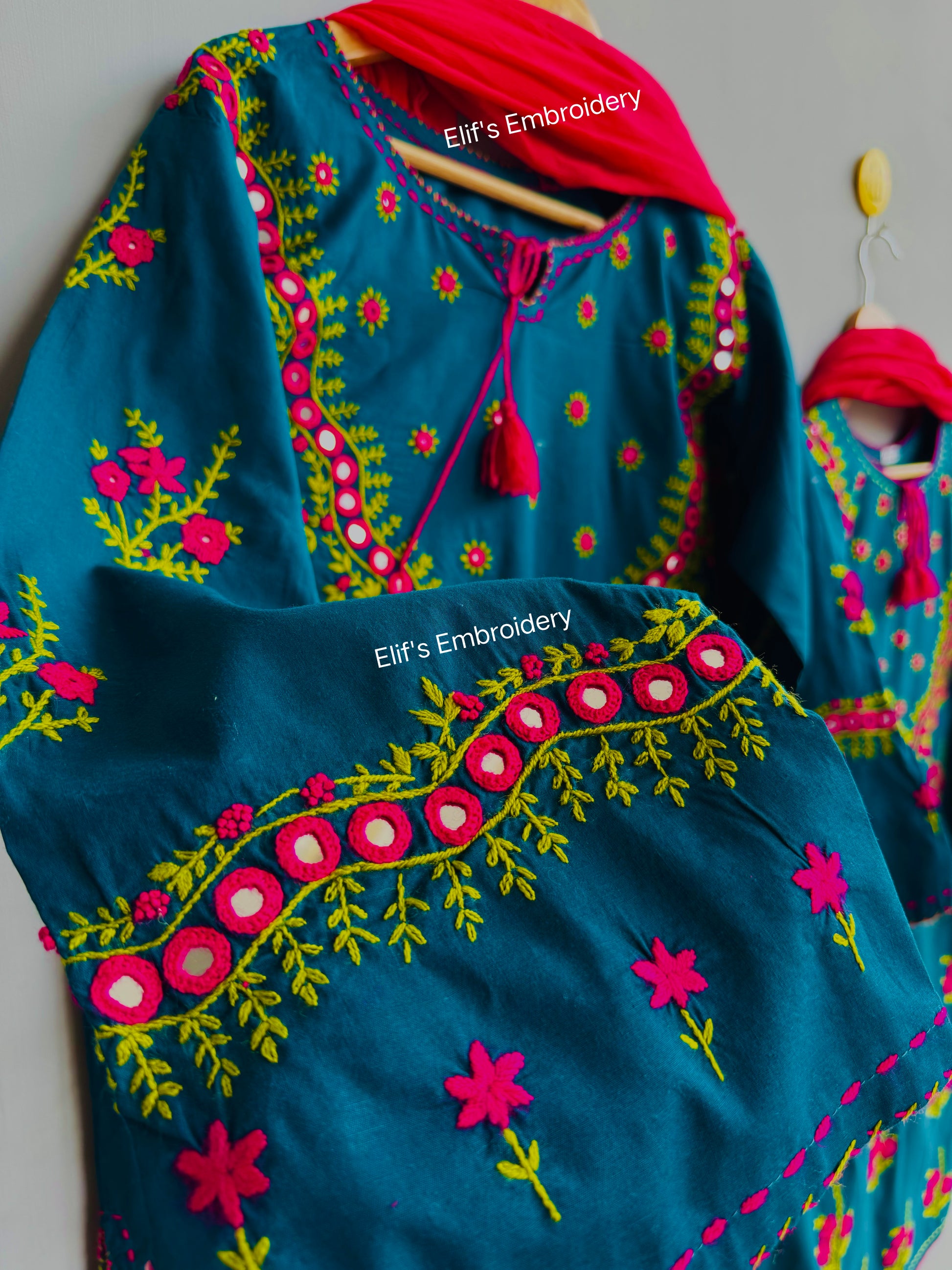 This zinc colored hand embroidered mom daughter duo is a perfect addition to any stylish wardrobe. Made with high-quality materials and exquisite stitching techniques, this duo showcases the beauty of intricate design and mother-daughter bonding. Upgrade your fashion game with this elegant and meaningful accessory.